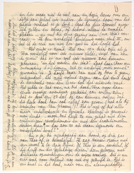 Er zal nog wel wat zijn, maar daarover later, als het je interesseert. Maar laat ik er nogmaals bij zeggen dat ik dikwijls met even groote ver-als be-wondering gezien heb hoe je de zaak met 2, 3 rake (ly-rische) zinnetjes weer op pooten zette. In ieder geval is het een heel curieus boek en in jouw ontwikkeling van wellicht het grootste belang. Maar je hebt gelijk: peuter hier maar niet te veel aan en begin liever over een tijdje aan geheel iets anders. De lyrische toon van het geheele verhaal is je fort; laat die dus zooveel mogelijk gelden en schrap, of bekort, alleen de zwakke plekken - en vul die eene gaping aan (na Vera's verraad). - Ik ben werkelijk benieuwd naar stuk III, omdat ik de rest nu nog zoo goed in het hoofd heb.