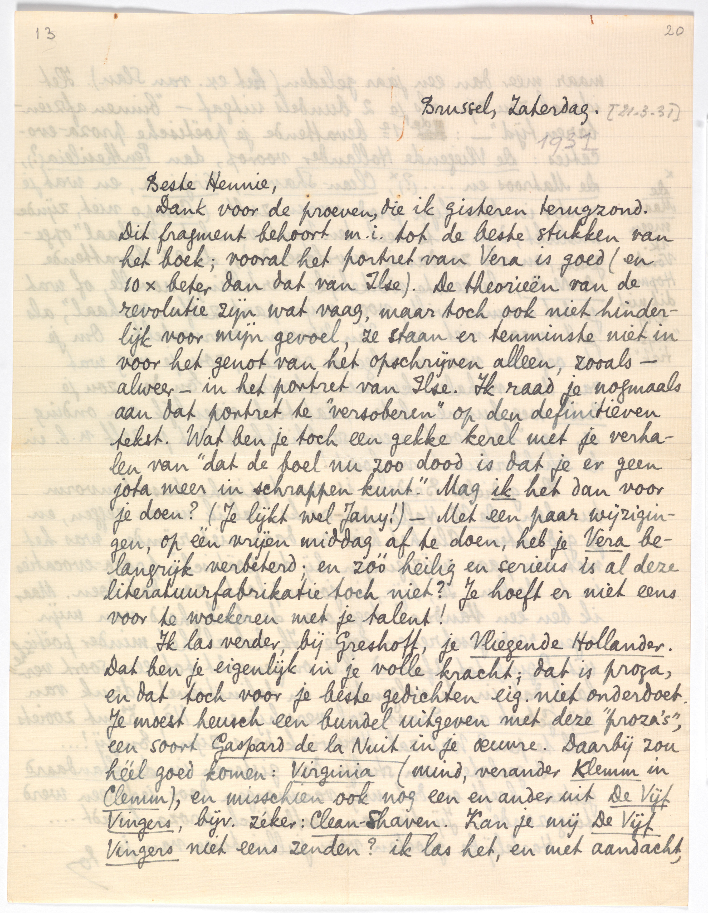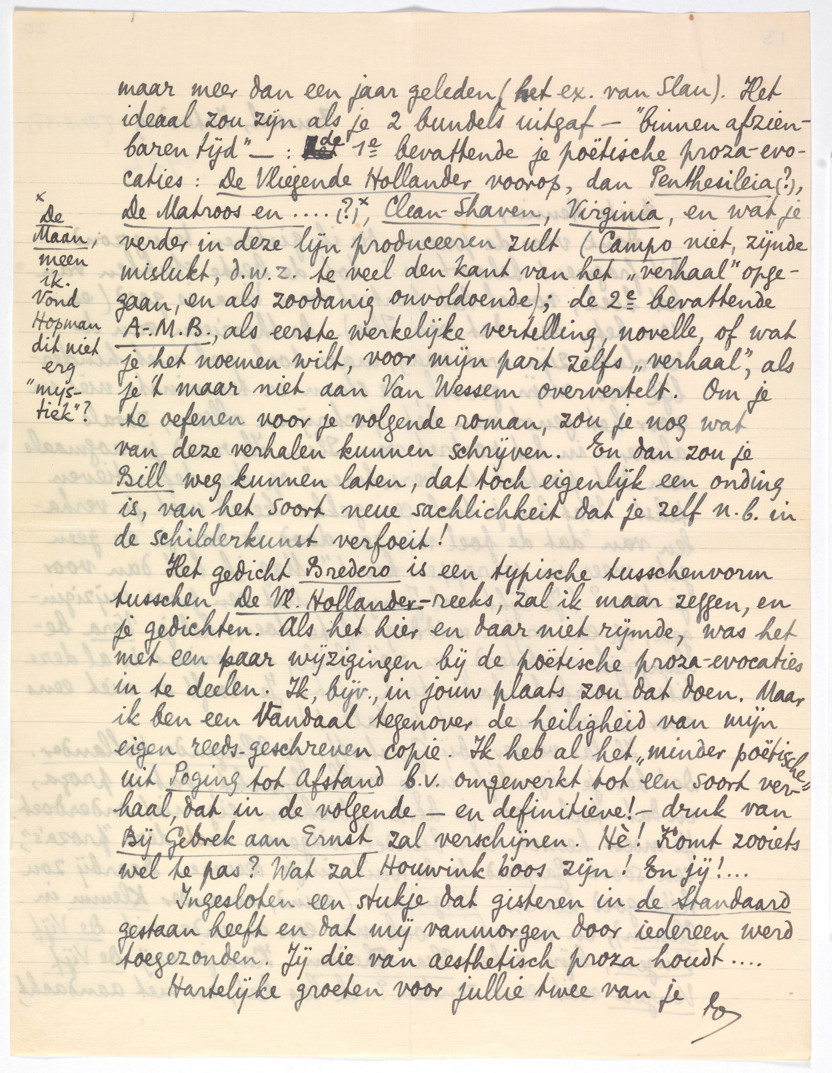 Ik las verder, bij Greshoff, je Vliegende Hollander. Dat ben je eigenlijk in je volle kracht; dat is proza, en dat toch voor je beste gedichten eig. niet onderdoet. Je moest heusch een bundel uitgeven met deze ‘proza's’,1631 een soort Gaspard de la Nuit in je oeuvre. Daarbij zou héél goed komen: Virginia (mind, verander Klemm in Clemm), en misschien ook nog een en ander uit De Vijf Vingers, bijv. zéker: Clean-Shaven. Kan je mij De Vijf Vingers niet eens zenden? ik las het, en met aandacht, maar meer dan een jaar geleden (het ex. van Slau). Het ideaal zou zijn als je 2 bundels uitgaf - ‘binnen afzienbaren tijd’ -: de 1e bevattende je poëtische proza-evocaties: De Vliegende Hollander voorop, dan Penthesileia (?), De Matroos en.... (?)*, Clean-Shaven, Virginia, en wat je verder in deze lijn produceeren zult (Campo niet, zijnde mislukt, d.w.z. te veel den kant van het ‘verhaal’ opgegaan, en als zoodanig onvoldoende); de 2e bevattende A-.M.B., als eerste werkelijke vertelling, novelle, of wat je het noemen wilt, voor mijn part zelfs ‘verhaal’, als je 't maar niet aan Van Wessem oververtelt. Om je te oefenen voor je volgende roman, zou je nog wat van deze verhalen kunnen schrijven. En dan zou je Bill weg kunnen laten, dat toch eigenlijk een onding is, van het soort neue sachlichkeit dat je zelf n.b. in de schilderkunst verfoeit!