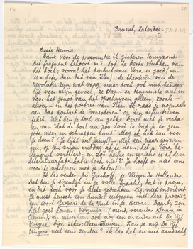Dank voor de proeven,1629 die ik gisteren terugzond. Dit fragment behoort m.i. tot de beste stukken van het boek; vooral het portret van Vera is goed (en 10 × beter dan dat van Ilse). De theorieën van de revolutie zijn wat vaag, maar toch ook niet hinderlijk voor mijn gevoel, ze staan er tenminste niet in voor het genot van het opschrijven alleen, zooals - alweer - in het portret van Ilse. Ik raad je nogmaals aan dat portret te ‘versoberen’ op den definitieven tekst. Wat ben je toch een gekke kerel met je verhalen van ‘dat de boel nu zoo dood is dat je er geen jota meer in schrappen kunt’. Mag ik het dan voor je doen? (Je lijkt wel Jany!) - Met een paar wijzigingen, op één vrijen middag af te doen, heb je Vera belangrijk verbeterd; en zóó heilig en serieus is al deze literatuurfabrikatie toch niet? Je hoeft er niet eens voor te woekeren met je talent!1630