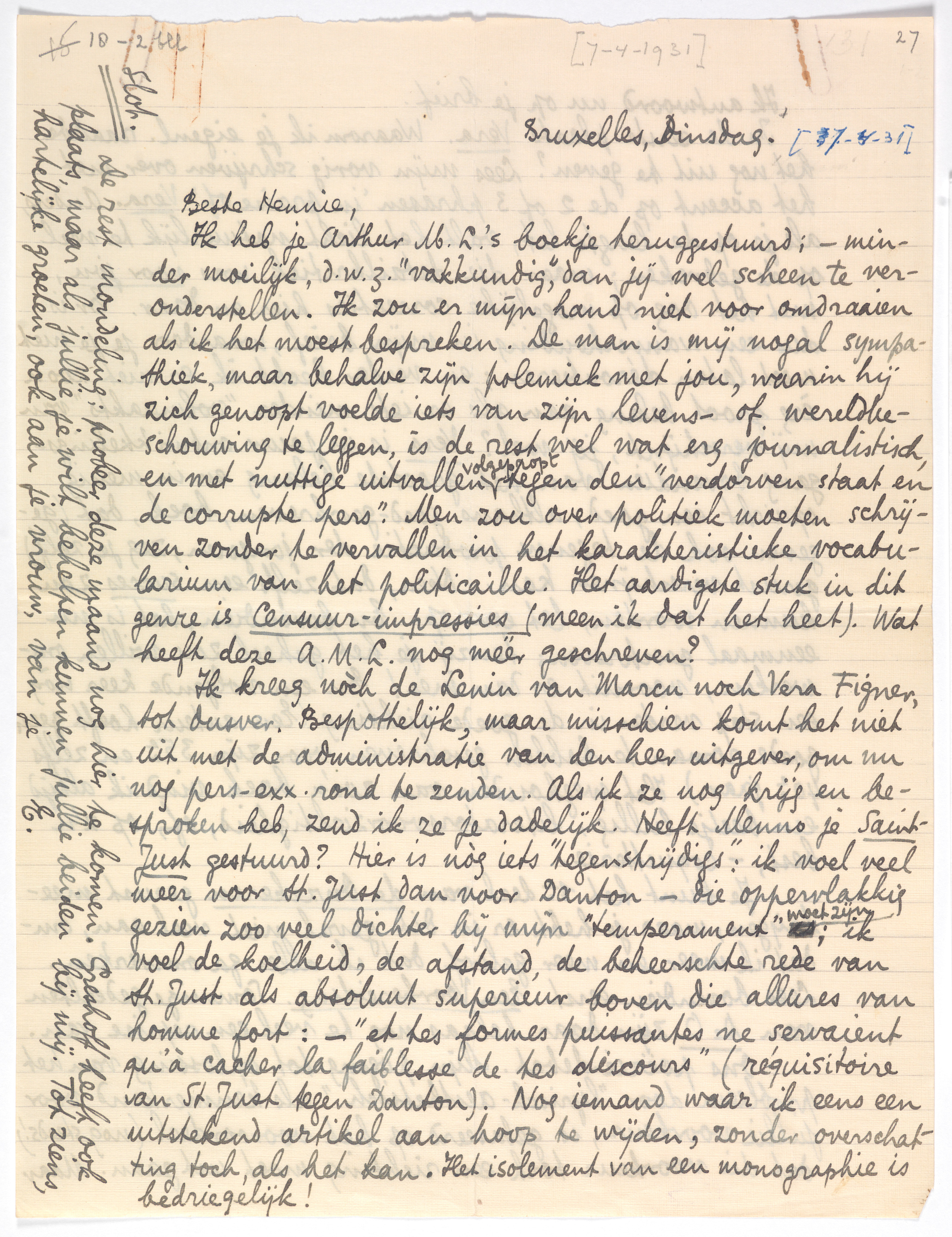 Ik kreeg nòch de Lenin van Marcu noch Vera Figner, tot dusver. Bespottelijk, maar misschien komt het niet uit met de administratie van den heer uitgever, om nu nog pers-exx. rond te zenden. Als ik ze nog krijg en besproken heb, zend ik ze je dadelijk. Heeft Menno je Saint-Just1635 gestuurd? Hier is nòg iets ‘tegenstrijdigs’: ik voel veel meer voor St. Just dan voor Danton - die oppervlakkig gezien zoo veel dichter bij mijn ‘temperament’ moet zijn; ik voel de koelheid, de afstand, de beheerschte rede van St. Just als absoluut superieur boven die allures van homme fort: - ‘et tes formes puissantes ne servaient qu'à cacher la faiblesse de tes discours’ (réquisitoire van St. Just tegen Danton). Nog iemand waar ik eens een uitstekend artikel aan hoop te wijden, zonder overschatting toch, als het kan. Het isolement van een monographie is bedriegelijk!