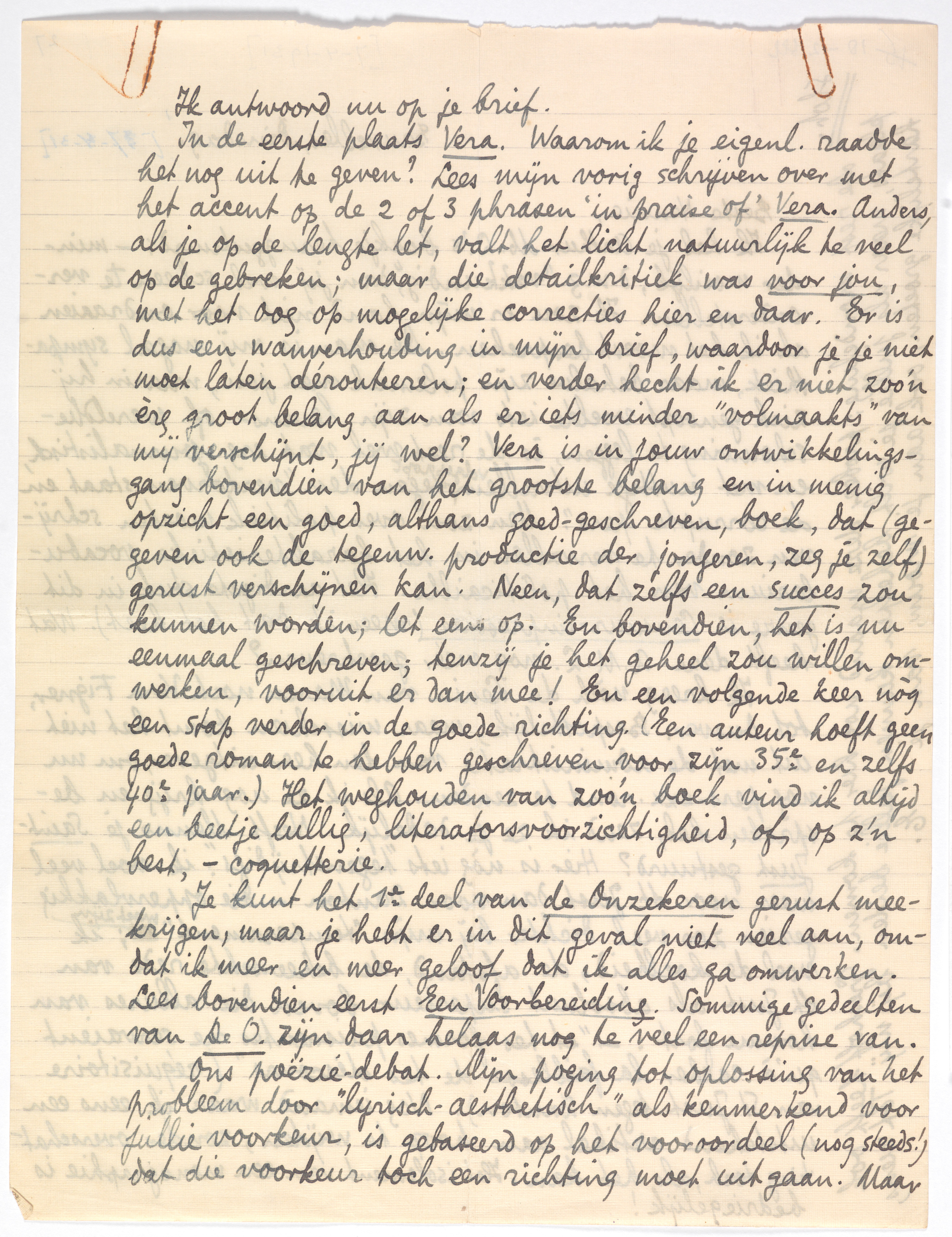 In de eerste plaats Vera. Waarom ik je eigenl. raadde het nog uit te geven? Lees mijn vorig schrijven over met het accent op de 2 of 3 phrasen ‘in praise of’ Vera. Anders, als je op de lengte let, valt het licht natuurlijk te veel op de gebreken; maar die detailkritiek was voor jou, met het oog op mogelijke correcties hier en daar. Er is dus een wanverhouding in mijn brief, waardoor je je niet moet laten dérouteeren; en verder hecht ik er niet zoo'n èrg groot belang aan als er iets minder ‘volmaakts’ van mij verschijnt, jij wel? Vera is in jouw ontwikkelingsgang bovendien van het grootste belang en in menig opzicht een goed, althans goed-geschreven, boek, dat (gegeven ook de tegenw. productie der jongeren, zeg je zelf) gerust verschijnen kan. Neen, dat zelfs een succes zou kunnen worden; let eens op. En bovendien, het is nu eenmaal geschreven; tenzij je het geheel zou willen omwerken, vooruit er dan mee! En een volgende keer nòg een stap verder in de goede richting. (Een auteur hoeft geen goede roman te hebben geschreven voor zijn 35e en zelfs 40e jaar.) Het weghouden van zoo'n boek vind ik altijd een beetje lullig, literators-voorzichtigheid, of, op z'n best, - coquetterie.
