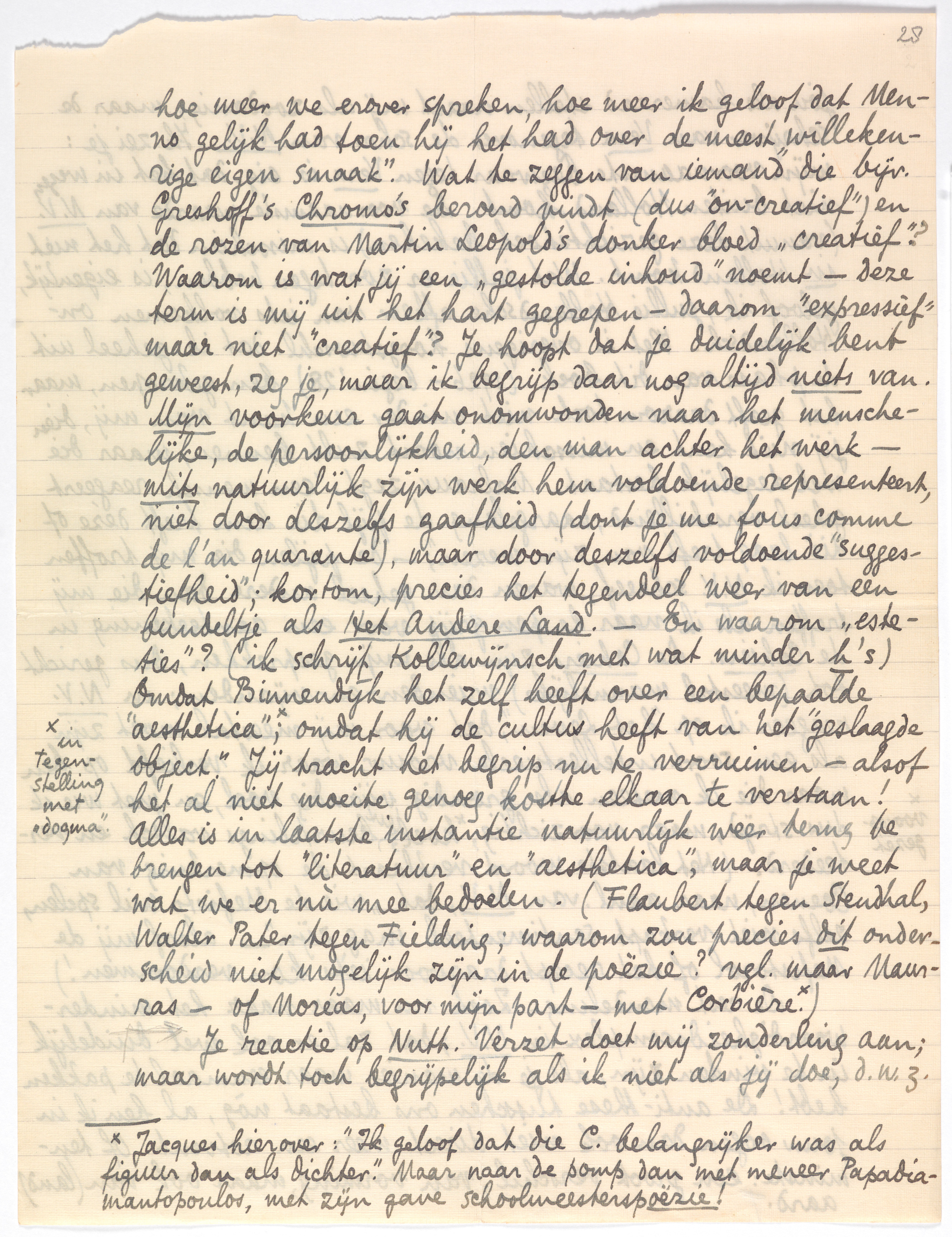 Ons poëzie-debat.1636 Mijn poging tot oplossing van het probleem door ‘lyrisch-aesthetisch’ als kenmerkend voor jullie voorkeur, is gebaseerd op het vooroordeel (nog steeds!) dat die voorkeur toch een richting moet uitgaan. Maar hoe meer we erover spreken, hoe meer ik geloof dat Menno gelijk had toen hij het had over de meest ‘willekeurige eigen smaak’. Wat te zeggen van iemand die bijv. Greshoff's Chromo's beroerd vindt (dus ‘on-creatief’) en de rozen van Martin Leopold's donker bloed1637 ‘creatief’? Waarom is wat jij een ‘gestolde inhoud’ noemt1638 - deze term is mij uit het hart gegrepen - daarom ‘expressief’ maar niet ‘creatief’? Je hoopt dat je duide-lijk bent geweest, zeg je, maar ik begrijp daar nog altijd niets van. Mijn voorkeur gaat onomwonden naar het menschelijke, de persoonlijkheid, den man achter het werk - mits natuurlijk zijn werk hem voldoende representeert, niet door deszelfs gaafheid (dont je me fous comme de l'an quarante), maar door deszelfs voldoende ‘suggestiefheid’; kortom, precies het tegendeel weer van een bundeltje als Het Andere Land. - En waarom ‘esteties’? (ik schrijf Kollewijnsch met wat minder h's) Omdat Binnendijk het zelf heeft1639 over een bepaalde ‘aesthetica’*; omdat hij de cultus heeft van het ‘geslaagde object’. Jij tracht het begrip nu te verruimen - alsof het al niet moeite genoeg kostte elkaar te verstaan! Alles is in laatste instantie natuurlijk weer terug te brengen tot ‘literatuur’ en ‘aesthetica’, maar je weet wat we er nù mee bedoelen. (Flaubert tegen Stendhal, Walter Pater tegen Fielding; waarom zou precies dit onderscheid niet mogelijk zijn in de poëzie? vgl. maar Maurras - of Moréas, voor mijn part - met Corbière.1640)