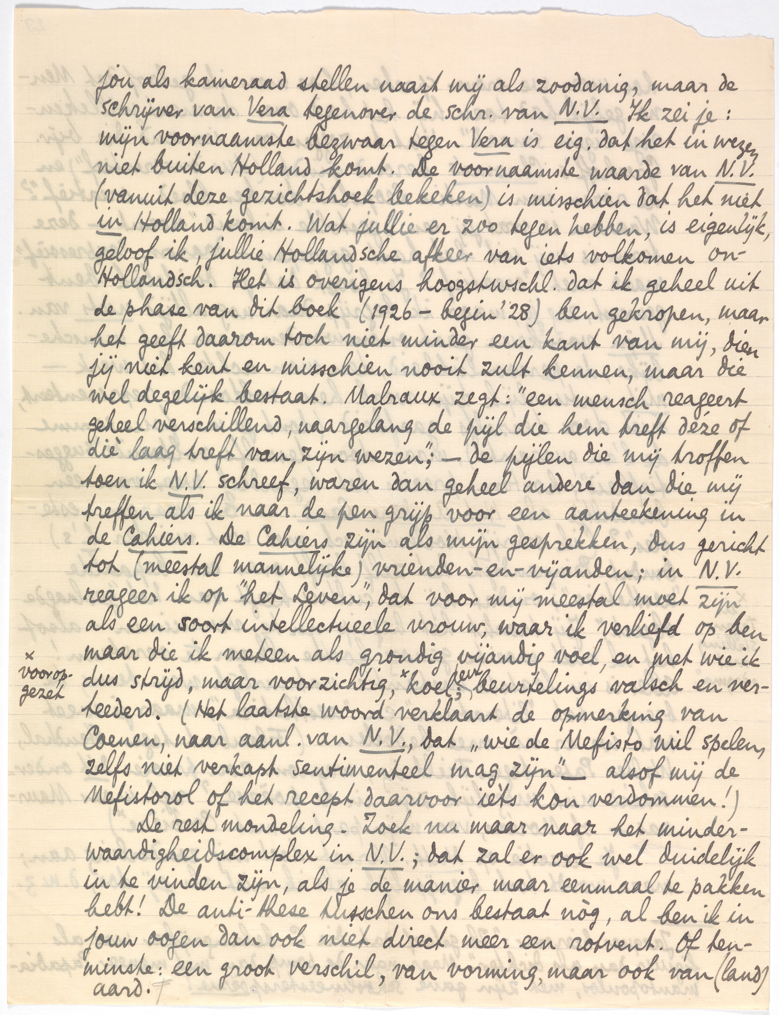 Je reactie op Nutt. Verzet doet mij zonderling aan; maar wordt toch begrijpelijk als ik niet als jij doe, d.w.z. jou als kameraad stellen naast mij als zoodanig, maar de schrijver van Vera tegenover de schr. van N.V. Ik zei je: mijn voornaamste bezwaar tegen Vera is eig. dat het in wezen niet buiten Holland komt. De voornaamste waarden van N.V. (vanuit deze gezichtshoek bekeken) is misschien dat het niet in Holland komt. Wat jullie er zoo tegen hebben, is eigenlijk, geloof ik, jullie Hollandsche afkeer van iets volkomen on-Hollandsch. Het is overigens hoogstwschl. dat ik geheel uit de phase van dit boek (1926-begin '28) ben gekropen, maar het geeft daarom toch niet minder een kant van mij, dien jij niet kent en misschien nooit zult kennen, maar die wel degelijk bestaat. Malraux zegt: ‘een mensch reageert geheel verschillend, naargelang de pijl die hem treft déze of diè laag treft van zijn wezen’; - de pijlen die mij troffen toen ik N.V. schreef, waren dan geheel andere dan die mij treffen als ik naar de pen grijp voor een aanteekening in de Cahiers. De Cahiers zijn als mijn gesprekken, dus gericht tot (meestal mannelijke) vrienden-en-vijanden; in N.V. reageer ik op ‘het Leven’, dat voor mij meestal moet zijn als een soort intellectueele vrouw, waar ik verliefd op ben maar die ik meteen als grondig vijandig voel, en met wie ik dus strijd, maar voorzichtig,* koel; en beurtelings valsch en verteederd. (Het laatste woord verklaart de opmerking van Coenen,1642 naar aanl. van N.V., dat ‘wie de Mefisto wil spelen, zelfs niet verkapt sentimenteel mag zijn’ - alsof mij de Mefistorol of het recept daarvoor ièts kon verdommen!)