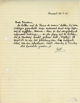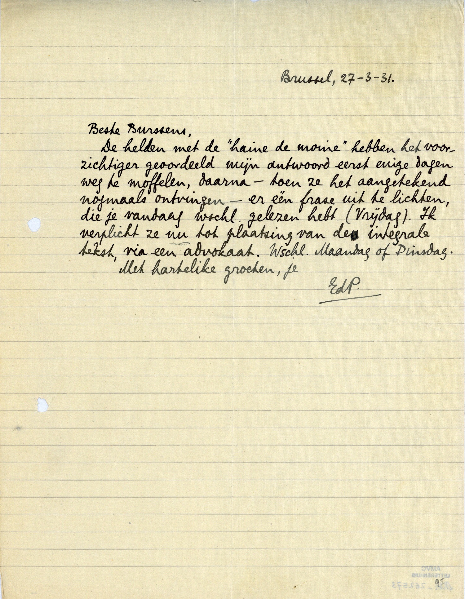 De helden met de ‘haine de moine’1650 hebben het voorzichtiger geoordeeld mijn antwoord eerst enige dagen weg te moffelen, daarna - toen ze het aangetekend nogmaals ontvingen - er één frase uit te lichten, die je vandaag wschl. gelezen hebt (Vrijdag). Ik verplicht ze nu tot plaatsing van de integrale tekst, via een advokaat. Wschl. Maandag of Dinsdag.