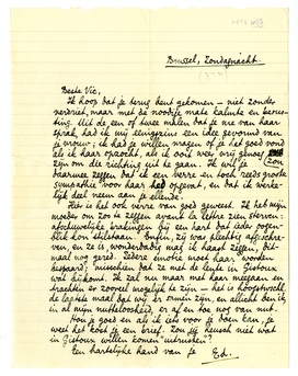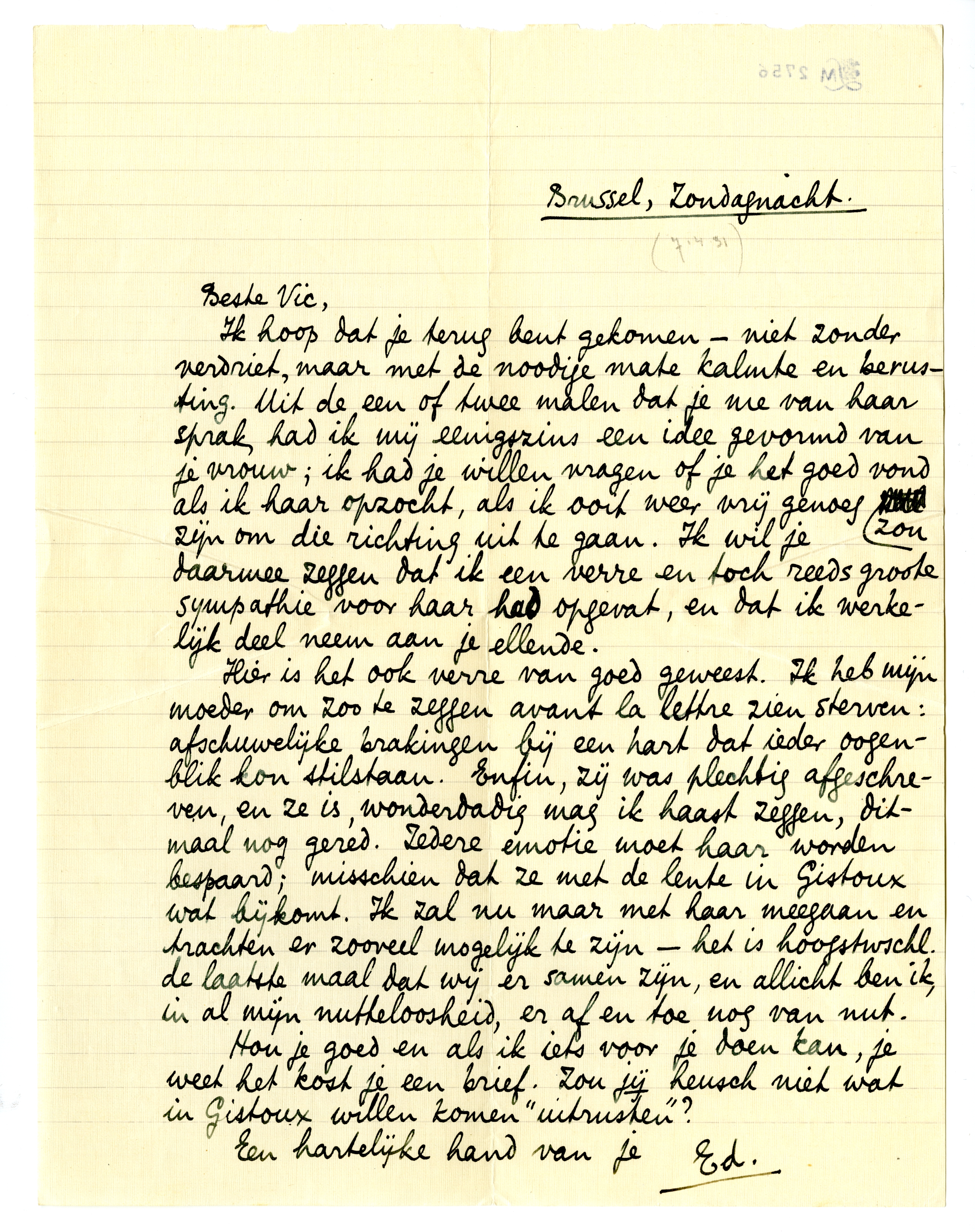 Hier is het ook verre van goed geweest. Ik heb mijn moeder om zoo te zeggen avant la lettre zien sterven: afschuwelijke brakingen bij een hart dat ieder oogenblik kon stilstaan. Enfin, zij was plechtig afgeschreven, en ze is, wonderdadig mag ik haast zeggen, ditmaal nog gered. Iedere emotie moet haar worden bespaard; misschien dat ze met de lente in Gistoux wat bijkomt. Ik zal nu maar met haar meegaan en trachten er zooveel mogelijk te zijn - het is hoogstwschl. de laatste maal dat wij er samen zijn, en allicht ben ik, in al mijn nutteloosheid, er af en toe nog van nut.