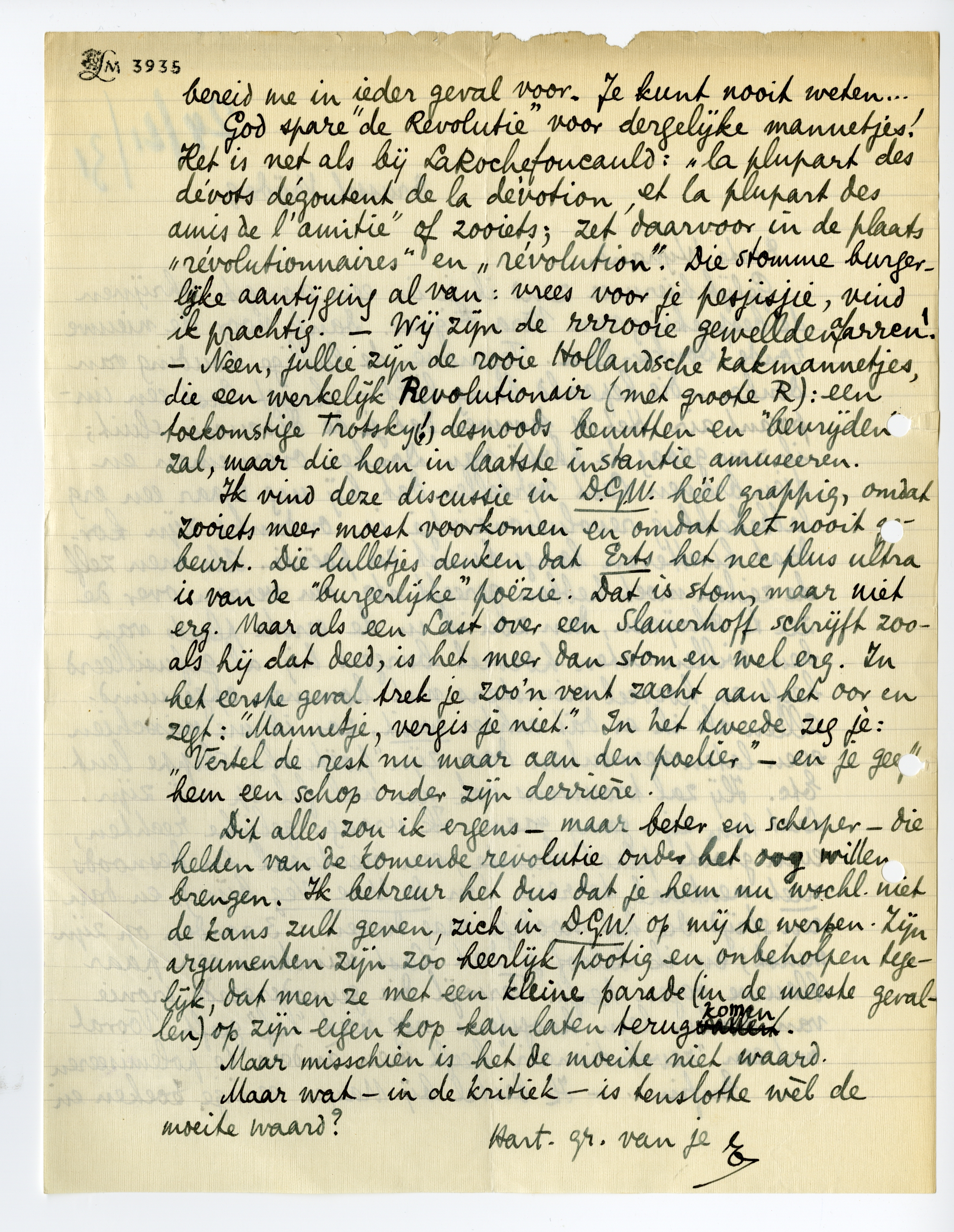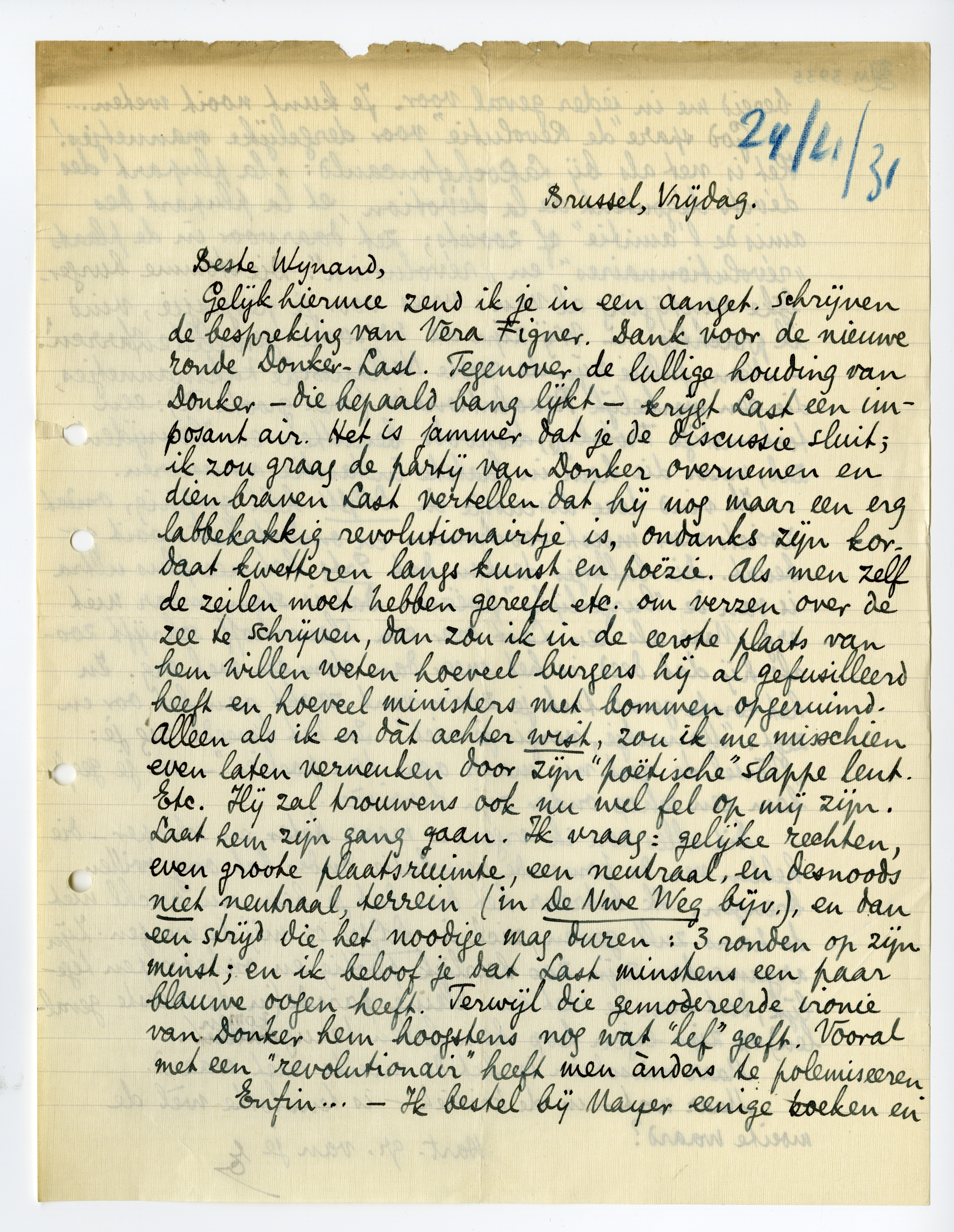 Alleen als ik er dàt achter wist, zou ik me misschien even laten verneuken door zijn ‘poëtische’ slappe leut. Etc. Hij zal trouwens ook nu wel fel op mij zijn. Laat hem zijn gang gaan. Ik vraag: gelijke rechten, even groote plaatsruimte, een neutraal, en desnoods niet neutraal, terrein (in De Nwe Weg bijv.), en dan een strijd die het noodige mag duren: 3 ronden op zijn minst; en ik beloof je dat Last minstens een paar blauwe oogen heeft. Terwijl die gemodereerde ironie van Donker hem hoogstens nog wat ‘lef’ geeft. Vooral met een ‘revolutionair’ heeft men ànders te polemiseeren.