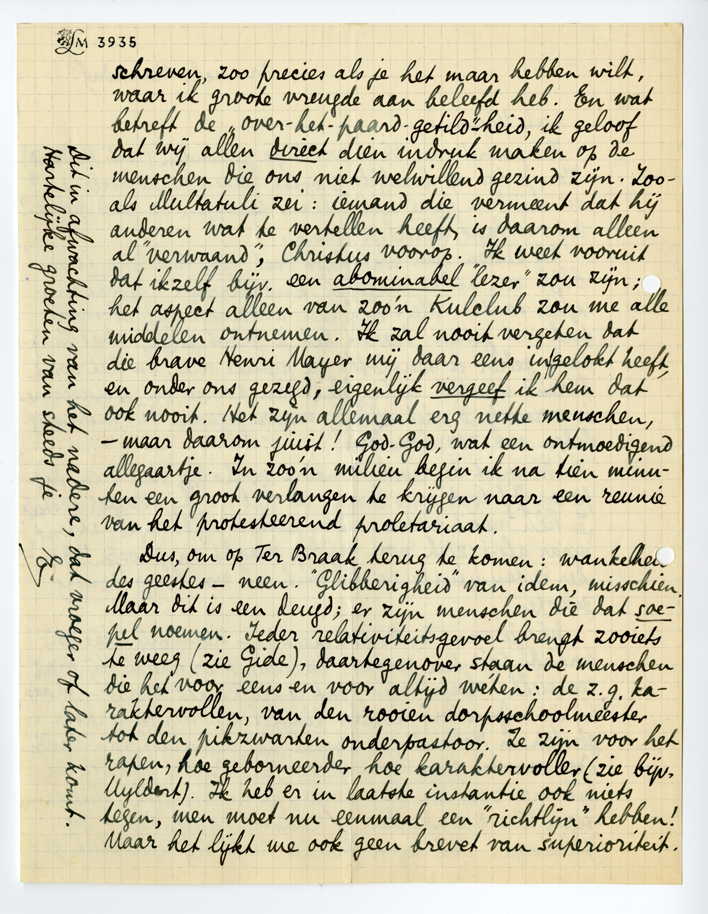 Wat je van Ter Braak zegt is - houd mij déze oneerbiedigheid ten goede - falikant er naast. Hij mag een slecht ‘lezer’ zijn, dat is een kunst apart - maar hij is volgens mij zonder twijfel een der scherpste geesten in Holland en vooral het tegendeel van vaag. Lees eens in Man tegen Man (als Sander daar eindelijk mee voor den dag komt) de meesterlijke stukken tegen Van Duinkerken - Roomsch kampioen - en Huizinga.1746 Ook tegen Donker1747 heeft hij een stuk geschreven, zoo precies als je het maar hebben wilt, waar ik groote vreugde aan beleefd heb. En wat betreft de ‘over-het-paard-getild’-heid, ik geloof dat wij allen direct dien indruk maken op de menschen die ons niet welwillend gezind zijn. Zooals Multatuli zei: iemand die vermeent dat hij anderen wat te vertellen heeft, is daarom alleen al ‘verwaand’, Christus voorop. Ik weet vooruit dat ikzelf bijv. een abominabel ‘lezer’ zou zijn; het aspect alleen van zoo'n Kulclub1748 zou me alle middelen ontnemen. Ik zal nooit vergeten dat die brave Henri Mayer mij daar eens in gelokt heeft, en onder ons gezegd, eigenlijk vergeef ik hem dat ook nooit. Het zijn allemaal erg nette menschen, - maar daarom juist! God-God, wat een ontmoedigend allegaartje. In zoo'n milieu begin ik na tien minuten een groot verlangen te krijgen naar een reünie van het protesteerend proletariaat.