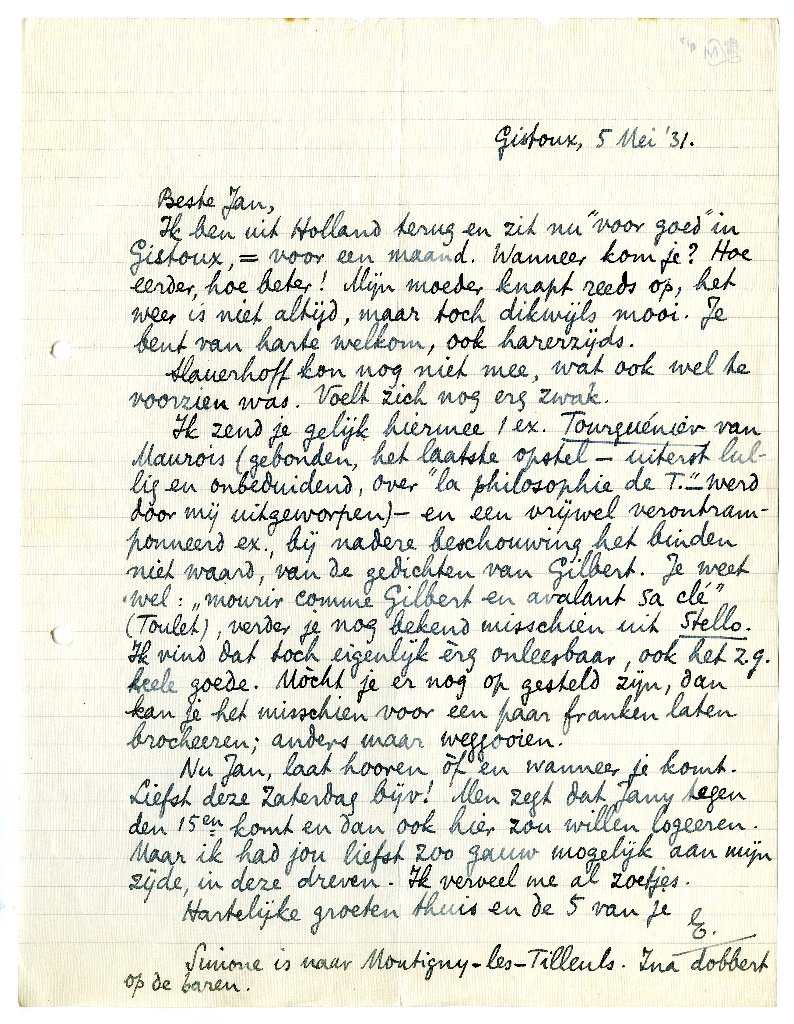 Ik ben uit Holland terug en zit nu ‘voor goed’ in Gistoux, = voor een maand. Wanneer kom je? Hoe eerder, hoe beter! Mijn moeder knapt reeds op, het weer is niet altijd, maar toch dikwijls mooi. Je bent van harte welkom, ook harerzijds.