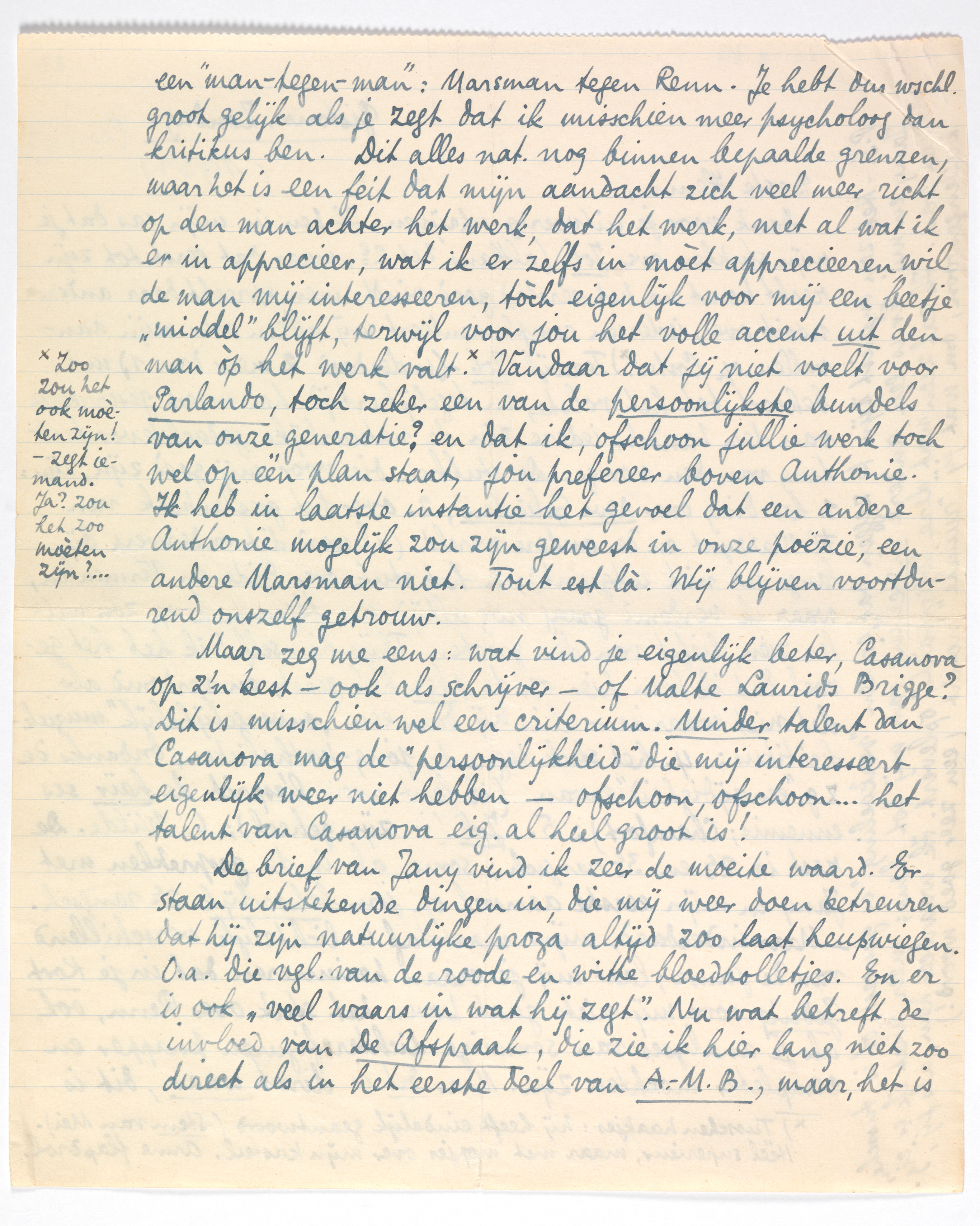 Dank voor je uitvoerig schrijven.1806 Ik ben in mijn sas dat je mijn stukken over Job (althans het 2e, maar dat eerst tot zijn recht komt na het eerste) goed vindt; men spreekt daar anders nooit over, iedereen complimenteert mij alleen over mijn aanvallen op Coster.* Terwijl Job - (inderdaad 2 meer dan 1) m.i. behoort tot het volste, en tegelijkertijd het meest geserreerde van den bundel; iedere zin de natuurlijke gedachtevoortzetting van den vorige. De stukken die voor mij goed zijn, zijn: 1. het ding over Nwe Geluiden; 2. over het geestenboek van Fl. Marryat en de andere wereld (al werd dit onderwerp bij lange na niet uitgeput); 3. het stuk over Gide en Vermeulen, waar ik verdomd graag nog altijd een tégenstuk op zou willen zien, liefst van den grooten Thijs himself! ik heb het gevoel dat ik hem hier op de plee heb gezet, en verdomd als het niet waar is - al is hij dan een ‘onvergelijkelijk’ muziekkritikus; 4. het stuk tegen de jong-katholieken, ondanks de z.g. ‘eenzijdigheid’ ervan (il faut avoir l'esprit de haïr ses ennemis1807; Chamfort); 5. Job (in zijn geheel); 6. Wilde. De rest is 2e en 3e rangsch; soms, als in de gesprekken met Jany en mijn eerste aanval op jou, behoorlijk 2e rangsch. - Maar inderdaad, mijn maatstaf is lichtelijk verschillend van de jouwe; laat mij je eraan herinneren dat in je Kort Geding voor mij niets gaat boven het stuk over Renn, ook als je analyses van sommige dichterfiguren knapper en completer mochten zijn. Maar dit is direct waar, dit is een ‘man-tegen-man’: Marsman tegen Renn. Je hebt dus wschl. groot gelijk als je zegt dat ik misschien meer psycholoog dan kritikus ben. Dit alles nat. nog binnen bepaalde grenzen, maar het is een feit dat mijn aandacht zich veel meer richt op den man achter het werk, dat het werk, met al wat ik er in apprecieer, wat ik er zelfs in moèt apprecieeren wil de man mij interesseeren, tòch eigenlijk voor mij een beetje ‘middel’ blijft, terwijl voor jou het volle accent uit den man òp het werk valt.* Vandaar dat jij niet voelt voor Parlando, toch zeker een van de persoonlijkste bundels van onze generatie? en dat ik, ofschoon jullie werk toch wel op één plan staat, jou prefereer boven Anthonie. Ik heb in laatste instantie het gevoel dat een andere Anthonie mogelijk zou zijn geweest in onze poëzie, een andere Marsman niet. Tout est là. Wij blijven voortdurend onszelf getrouw.