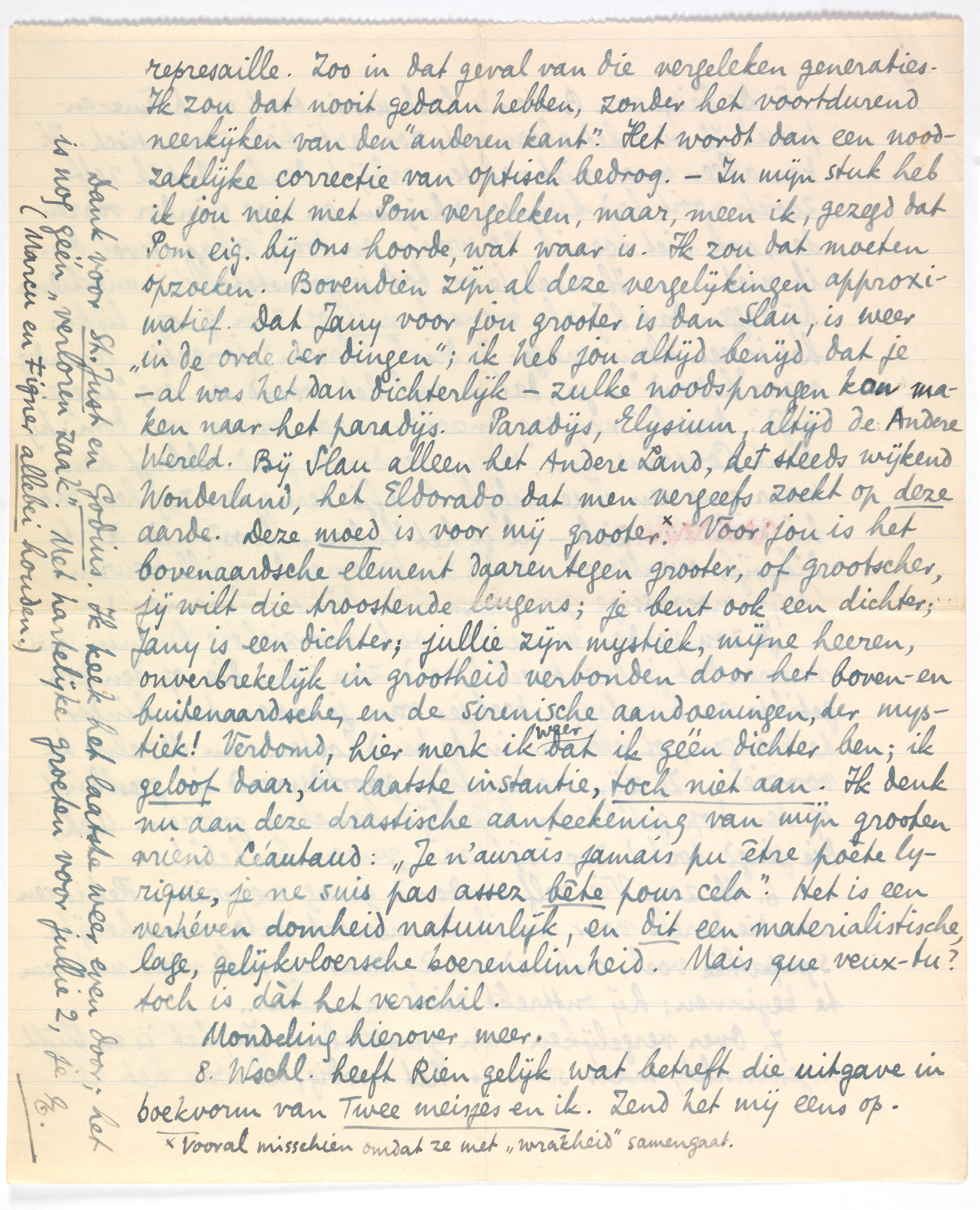 | 7. | Over vergelijken van grootheden. Ja, het is en blijft ongewenscht, maar soms is het noodig, al was het als represaille. Zoo in dat geval van die vergeleken generaties. Ik zou dat nooit gedaan hebben, zonder het voortdurend neerkijken van den ‘anderen kant’. Het wordt dan een noodzakelijke correctie van optisch bedrog. - In mijn stuk heb ik jou niet met Pom vergeleken,1813 maar, meen ik, gezegd dat Pom eig. bij ons hoorde, wat waar is. Ik zou dat moeten opzoeken. Bovendien zijn al deze vergelijkingen approximatief. Dat Jany voor jou grooter is dan Slau, is weer ‘in de orde der dingen’; ik heb jou altijd benijd dat je - al was het dan dichterlijk - zulke noodsprongen kan maken naar het paradijs. Paradijs, Elysium, altijd de Andere Wereld. Bij Slau alleen het Andere Land, het steeds wijkend Wonderland, het Eldorado, dat men vergeefs zoekt op deze aarde. Deze moed is voor mij grooter.* Voor jou is het bovenaardsche element daarentegen grooter, of grootscher, jij wilt die troostende leugens;je bent ook een dichter; Jany is een dichter; julli zijn mystiek, mijne heeren, onverbrekelijk in grootheid verbonden door het boven- en buitenaardsche, en de sirenische aandoeningen, der mystiek! Verdomd, hier merk ik weer dat ik géén dichter ben; ik geloof daar, in laatste instantie, toch niet aan. Ik denk nu aan deze drastische aanteekening van mijn grooten vriend Léautaud: ‘Je n'aurais jamais pu être poète lyrique, je ne suis pas assez bête pour cela’.1814 Het is een verhéven domheid natuurlijk, en dit een materialistische, lage, gelijkvloersche boerenslimheid. Mais que veux-tu? toch is dàt het verschil.