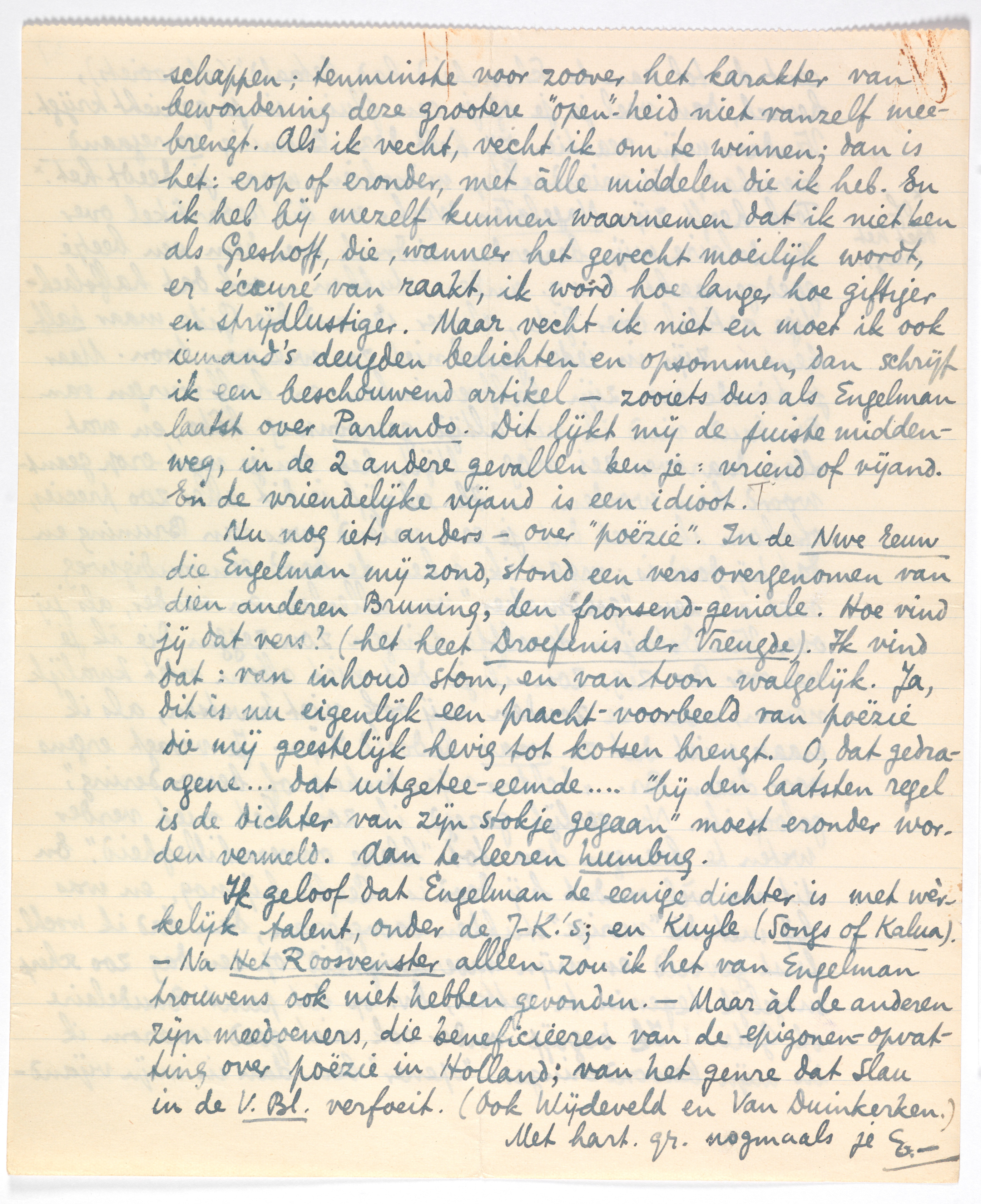 O ja, ik ben je misschien ook nog een verklaring schuldig over dat stukje over Ger. Bruning1817 (buiten mijn anti-Roomschheid om). Ik kende, toen ik dat schreef, zijn Nagelaten Werk niet, alleen zijn portret - dat mij nog altijd hoogst antipathiek is, ofschoon ik het bij lange na niet zoo belachelijk vind als het ‘geniale’ portret van zijn broer - en de studie over Baudelaire,1818 in Erts II. Nu moet je weten dat ik in dien tijd dagelijks omging met Pascal Pia, iemand die Baudelaire kent als geen ander, die zelf in zijn leven veel met B. gemeen heeft (ziekte, voortdurend geldgebrek, enz.; - ik schreef op hèm De Katastrofe, verder is hij ‘Vincent’ uit Huize-aan-Zee en ‘Daniel’ uit De Avonturiers), en als je dàn dat echte Hollandsche opstel leest, met van die hysterische hijgzinnen erin als: ‘...en toen Baudelaire tot de laatste, láátste cent de tol aan de Schoonheid had betaald’ (of zooiets), heusch, dan voel je je of je een fluim in je gezicht krijgt. Vandaar mijn reactie. Jij hebt deze Bruning verregaand overschat; uit vriendschap misschien, maar je deedt het.* Toch heeft zijn Nagelaten Werk, na dit rotartikel over Baudelaire, mijn beroerden indruk over hem een beetje goedgemaakt, d.w.z. andere stukken - ook dat halfslachtige artikel over Gide,1819 alweer iemand die Gide maar half kent - zijn in ieder geval niet zoo wee van toon. Maar je tirade over zijn halfverminken en half-wurgen van Rimbaud1820 vind ik nog altijd gewoonweg bête, en wat Slau daarover zei nog altijd het eenige wat erop geantwoord kan worden. - Ik schrijf je dit alles zo precies, ofschoon ik weet dat je een vriend was van Bruning en dat hij dood is; maar ik erken de dood eenvoudigweg niet als een ‘goedmaker’ van allerlei, en verder, als jij over Van Ostaijen dezelfde dingen zou zeggen die ik je nu over Br. zeg, zou ik je dat niet alleen niet kwalijk nemen, maar ze zouden mij ook niet kwetsen, als ik maar wist dat ze waar bedoeld zijn. Je vraagt ergens voor dezen Br. ‘heldere vijandschap of bewondering’, geloof ik. Nu, eerlijk gezegd, ik zou het niet verder weten te brengen dan tot ‘klare onverschilligheid’. En dit nu wèl omdat hij dood is. Leefde hij nog, en was hij met die ‘vurige’ stukken doorgegaan, dan had ik wschl. lust gevoeld er mijn ‘moerassigheid’ op een dag zoo scherp mogelijk tegenin te zetten, bv. op het punt Baudelaire of Gide. Ik begrijp verder ook niet goed waarom ik in mijn bewonderingen ‘opener’ ben dan in mijn vijandschappen; tenminste voor zoover het karakter van bewondering deze grootere ‘open’-heid niet vanzelf meebrengt. Als ik vecht, vecht ik om te winnen; dan is het; erop of eronder, met àlle middelen die ik heb. En ik heb bij mezelf kunnen waarnemen dat ik niet ben als Greshoff, die, wanneer het gevecht moeilijk wordt, er écoeuré van raakt, ik word hoe langer hoe giftiger en strijdlustiger. Maar vecht ik niet en moet ik ook iemand's deugden belichten en opsommen, dan schrijf ik een beschouwend artikel - zooiets dus als Engelman laatst over Parlando.1821 Dit lijkt mij de juiste middenweg, in de 2 andere gevallen ben je; vriend of vijand. En de vriendelijke vijand is een idioot.