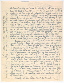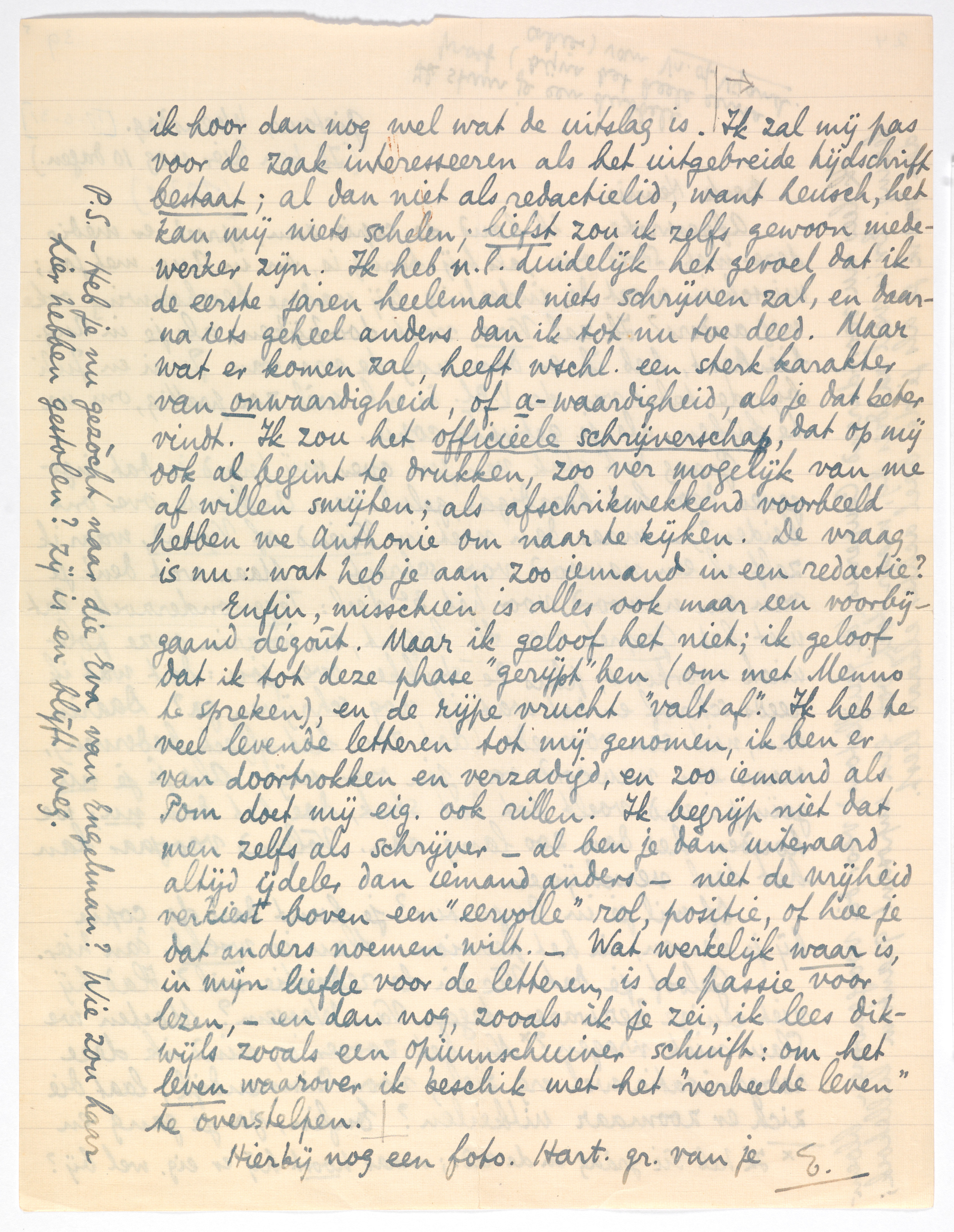 Geloof je dat Vic in de redactie wil?1849 Had hij niet eenige bezwaren tegen Van Wessem? Moeten we Slau niet vragen?* Nu het zoover is, vind ik deze reorganisatie wel erg zielig voor Binnendijk; laat die zich er zoomaar uitkeilen? Enfin, ga je gang en ik hoor dan nog wel wat de uitslag is. Ik zal mij pas voor de zaak interesseeren als het uitgebreide tijdschrift bestaat; al dan niet als redactielid, want heusch, het kan mij niets schelen; liefst zou ik zelfs gewoon medewerker zijn. Ik heb n.l. duidelijk het gevoel dat ik de eerste jaren heelemaal niets schrijven zal, en daarna iets geheel anders dan ik tot nu toe deed. Maar wat er komen zal, heeft wschl. een sterk karakter van onwaardigheid, of a-waardigheid, als je dat beter vindt. Ik zou het officieele schrijverschap, dat op mij ook al begint te drukken, zoo ver mogelijk van me af willen smijten; als afschrikwekkend voorbeeld hebben we Anthonie om naar te kijken. De vraag is nu: wat heb je aan zoo iemand in een redactie?