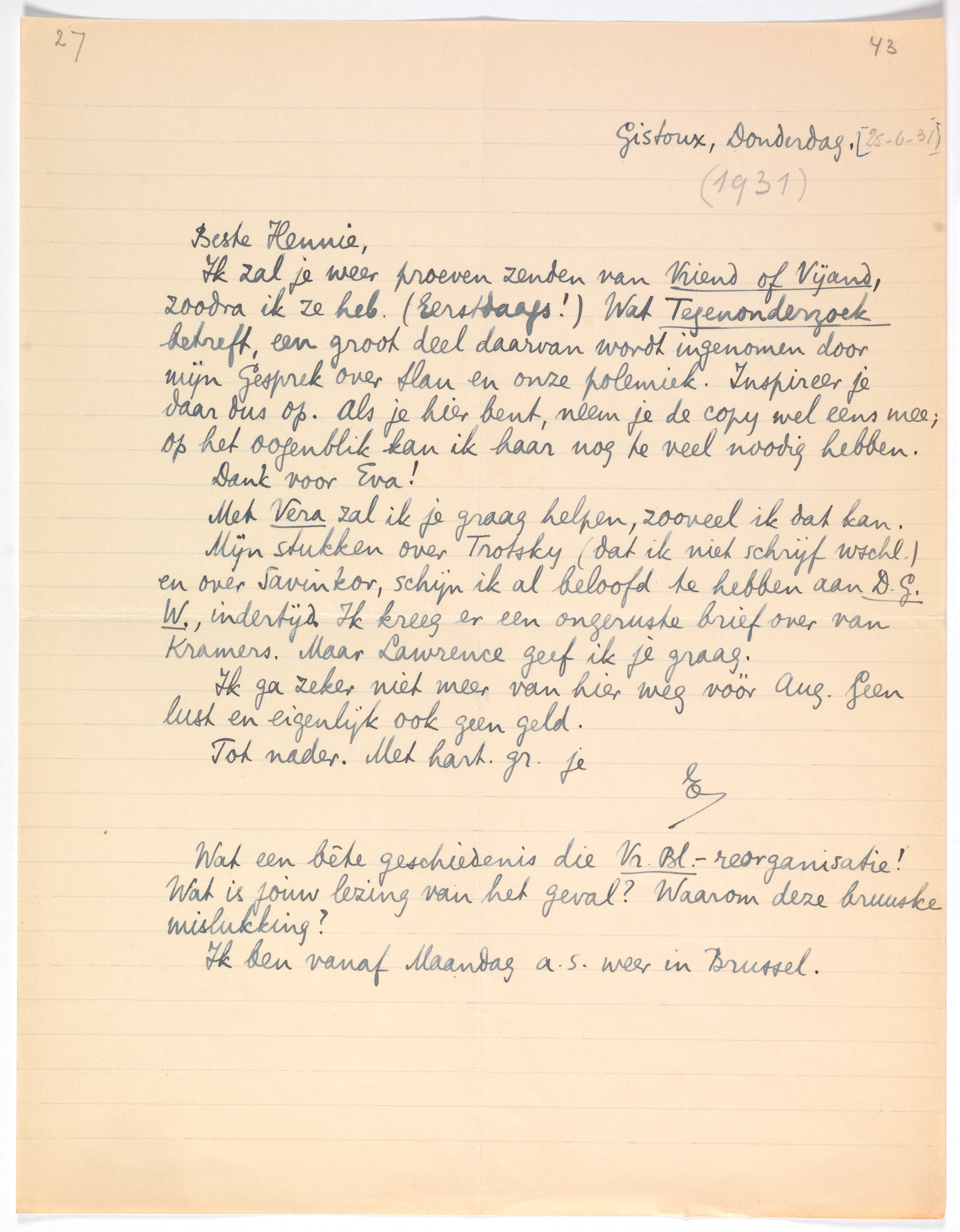 Ik zal je weer proeven zenden van Vriend of Vijand, zoodra ik ze heb. (Eerstdaags!) Wat Tegenonderzoek betreft, een groot deel daarvan wordt ingenomen door mijn Gesprek over Slau en onze polemiek. Inspireer je daar dus op. Als je hier bent, neem je de copy wel eens mee; op het oogenblik kan ik haar nog te veel noodig hebben.