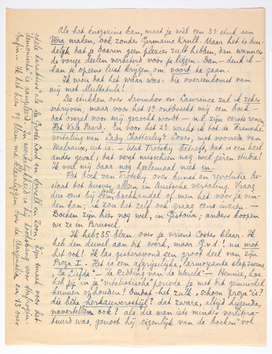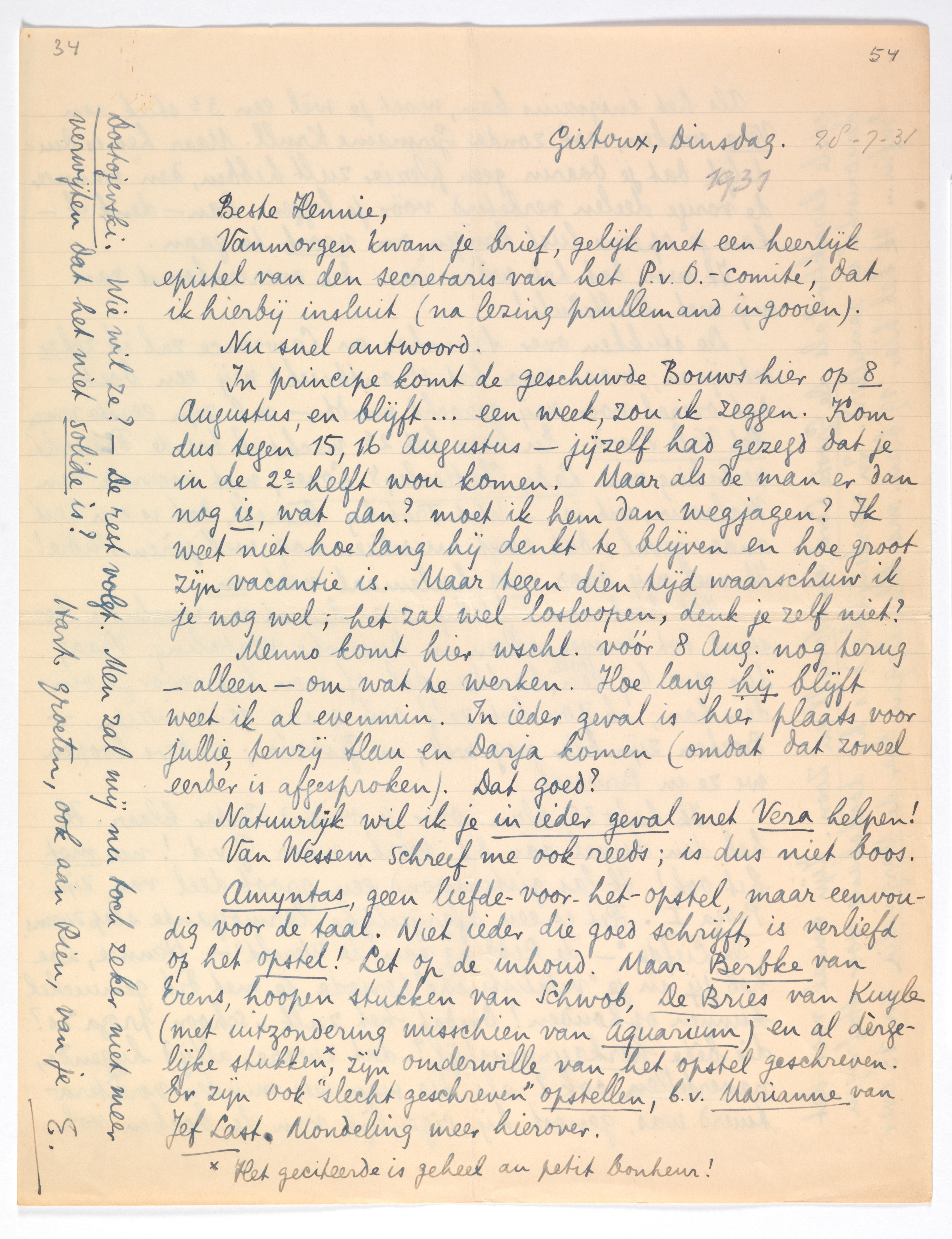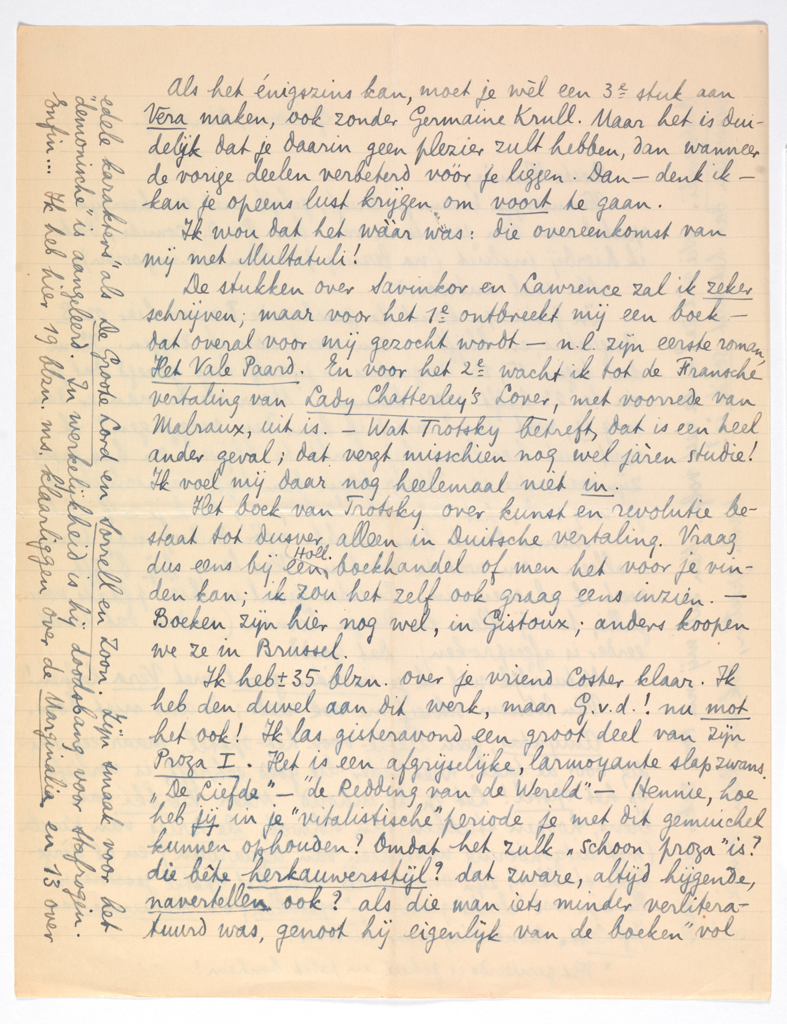 Ik heb ± 35 blzn. over je vriend Coster klaar. Ik heb den duvel aan dit werk, maar G.v.d.! nu mot het ook! Ik las gisteravond een groot deel van zijn Proza I. Het is een afgrijselijke, larmoyante slapzwans. ‘De Liefde’ - ‘de Redding van de Wereld’ - Hennie, hoe heb jij in je ‘vitalistische’ periode je met dit gemuichel kunnen ophouden? Omdat het zulk ‘schoon proza’ is? die bête herkauwersstijl? dat zware, altijd hijgende, navertellen ook? als die man iets minder verliteratuurd was, genoot hij eigenlijk van de boeken ‘vol edele karakters’ als De Groote Lord en Sorell en Zoon. Zijn smaak voor het ‘demoni-sche’ is aangeleerd. In werkelijkheid is hij doodsbang voor Stafrogin.1926 Enfin... Ik heb hier 19 blzn. ms. klaarliggen over de Marginalia en 13 over Dostojevski. Wie wil ze? - De rest volgt. Men zal mij nu toch zeker niet meer verwijten dat het niet solide is?