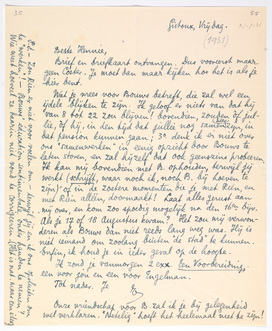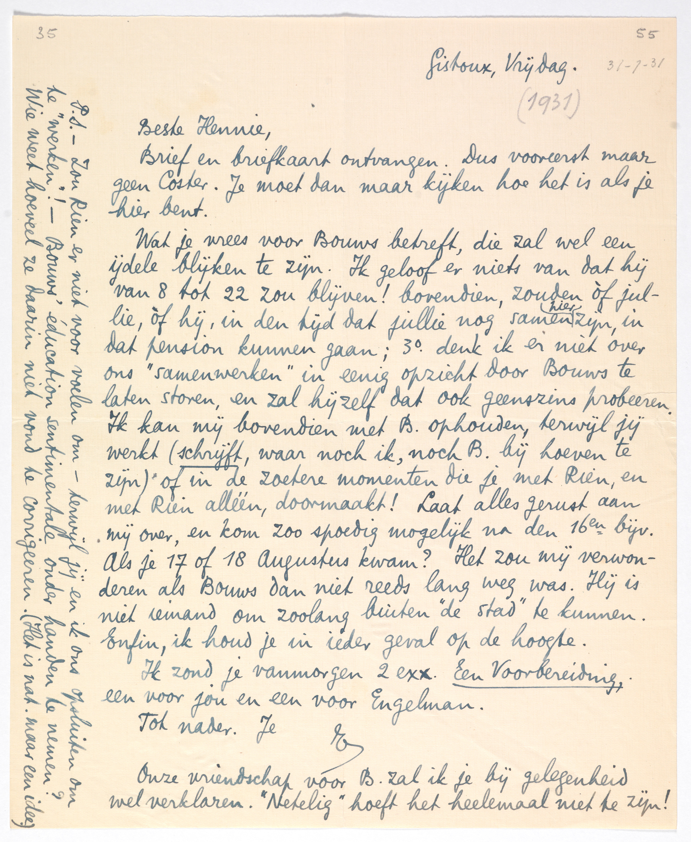 Wat je vrees voor Bouws betreft, die zal wel een ijdele blijken te zijn. Ik geloof er niets van dat hij van 8 tot 22 zou blijven! bovendien, zouden òf jullie, òf hij, in den tijd dat jullie nog samen hier zijn, in dat pension kunnen gaan; 3o. denk ik er niet over ons ‘samenwerken’ in eenig opzicht door Bouws te laten storen, en zal hijzelf dat ook geenszins probeeren. Ik kan mij bovendien met B. ophouden, terwijl jij werkt (schrijft, waar noch ik, noch B. bij hoeven te zijn) of in de zoetere momenten die je met Rien, en met Rien alléén, doormaakt! Laat alles gerust aan mij over, en kom zoo spoedig mogelijk na den 16en bijv. Als je 17 of 18 Augustus kwam? Het zou mij verwonderen als Bouws dan niet reeds lang weg was. Hij is niet iemand om zoolang buiten ‘de stad’ te kunnen. Enfin, ik houd je in ieder geval op de hoogte.