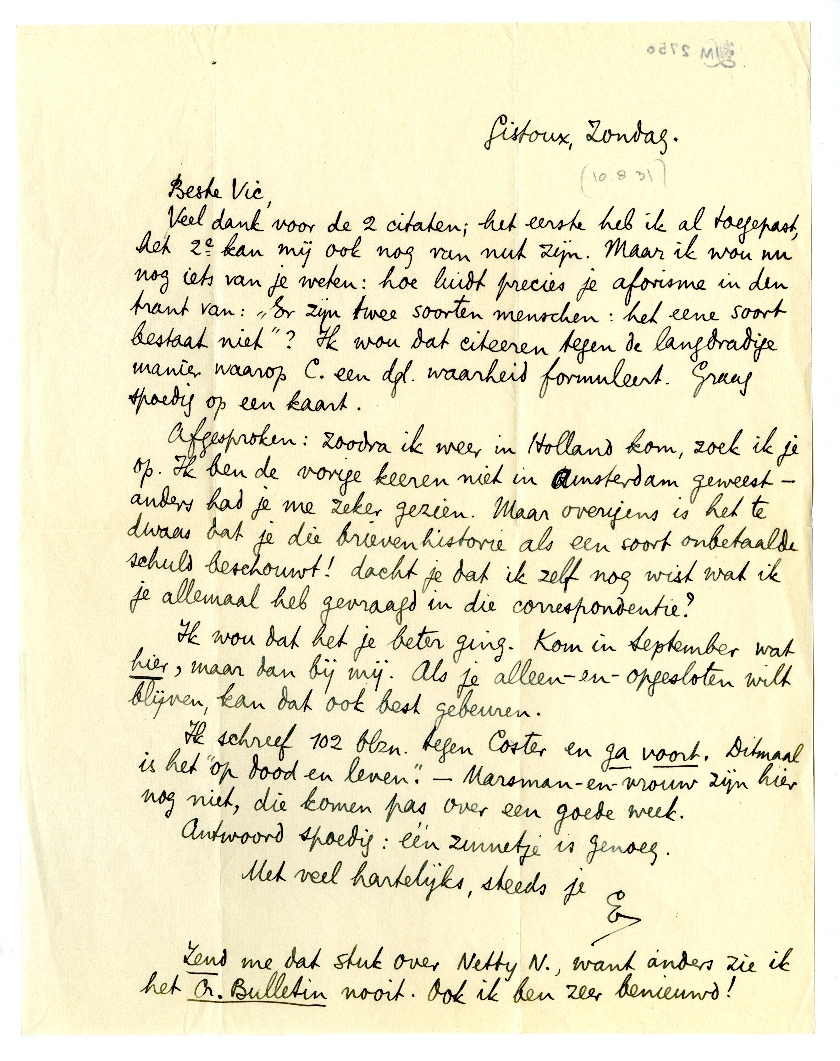 Veel dank voor de 2 citaten; het eerste heb ik al toegepast, het 2e kan mij ook nog van nut zijn. Maar ik wou nu nog iets van je weten: hoe luidt precies je aforisme in den trant van: ‘Er zijn twee soorten menschen: het eene soort bestaat niet’?1942 Ik wou dat citeeren tegen de langdradige manier waarop C. een dgl. waarheid formuleert. Graag spoedig op een kaart.