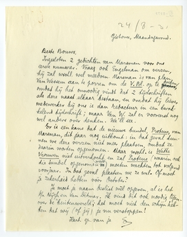Ingesloten 2 gedichten van Marsman1955 voor ons eerste nummer. Vraag ook Engelman om verzen, hij zal wschl. wel meedoen. Marsman is van plan Van Wessem aan te porren om de V. Bl. op te doeken, omdat hij het onnoodig vindt dat 2 tijdschriften als deze naast elkaar bestaan, en omdat hij liever medewerker bij ons is dan redacteur in een kwakkelend tijdschrift; maar Van W. zal er vooreerst nog wel anders over denken. We'll see.