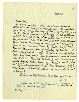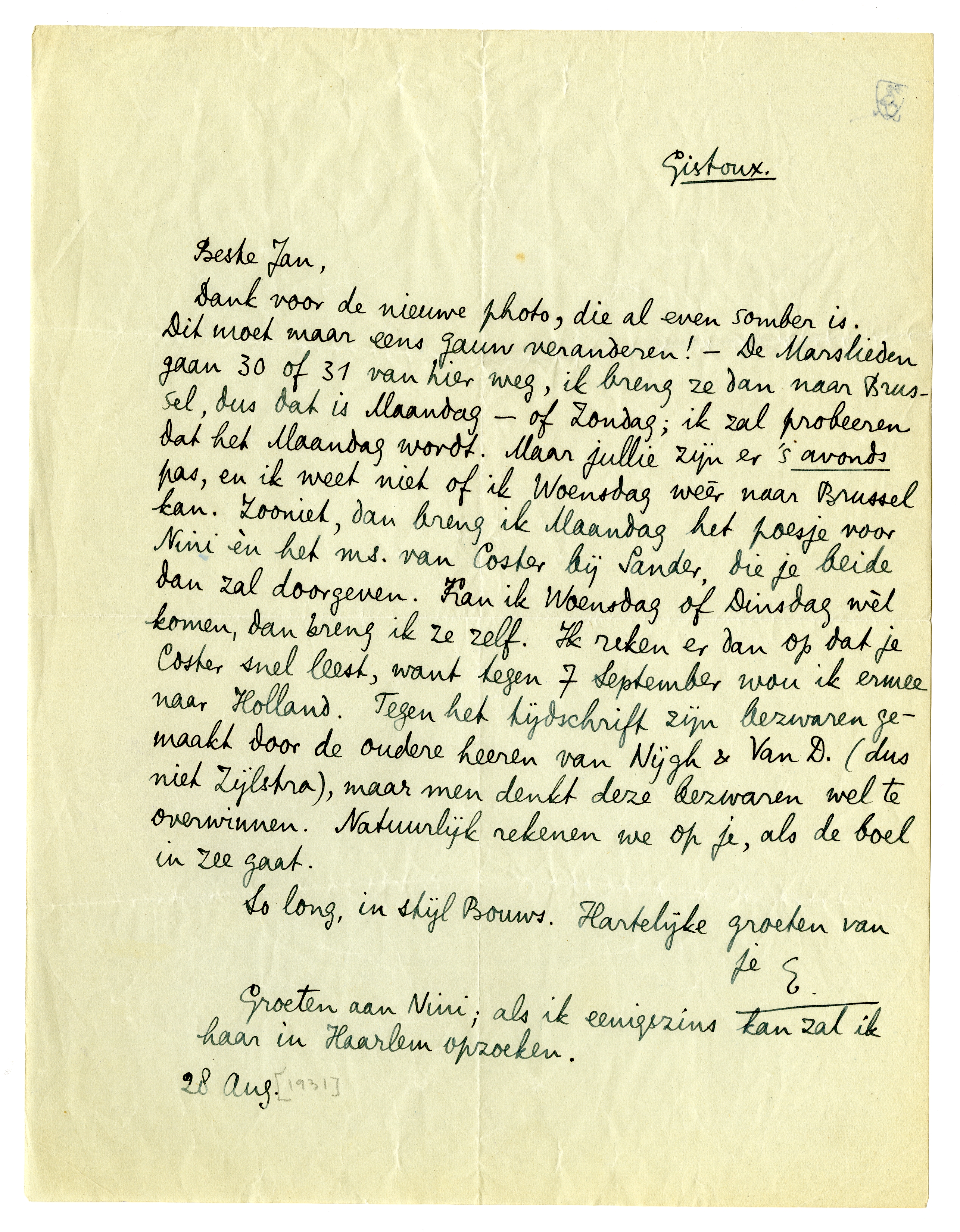 Dank voor de nieuwe photo, die al even somber is. Dit moet maar eens gauw veranderen! - De Marslieden gaan 30 of 31 van hier weg, ik breng ze dan naar Brussel, dus dat is Maandag - of Zondag; ik zal probeeren dat het Maandag wordt. Maar jullie zijn er 's avonds pas, en ik weet niet of ik Woensdag weér naar Brussel kan. Zooniet, dan breng ik Maandag het poesje voor Nini èn het ms. van Coster bij Sander, die je beide dan zal doorgeven. Kan ik Woensdag of Dinsdag wél komen, dan breng ik ze zelf. Ik reken er dan op dat je Coster snel leest, want tegen 7 September wou ik ermee naar Holland. Tegen het tijdschrift zijn bezwaren gemaakt door de oudere heeren van Nijgh & Van D. (dus niet Zijlstra), maar men denkt deze bezwaren wel te overwinnen. Natuurlijk rekenen we op je, als de boel in zee gaat.