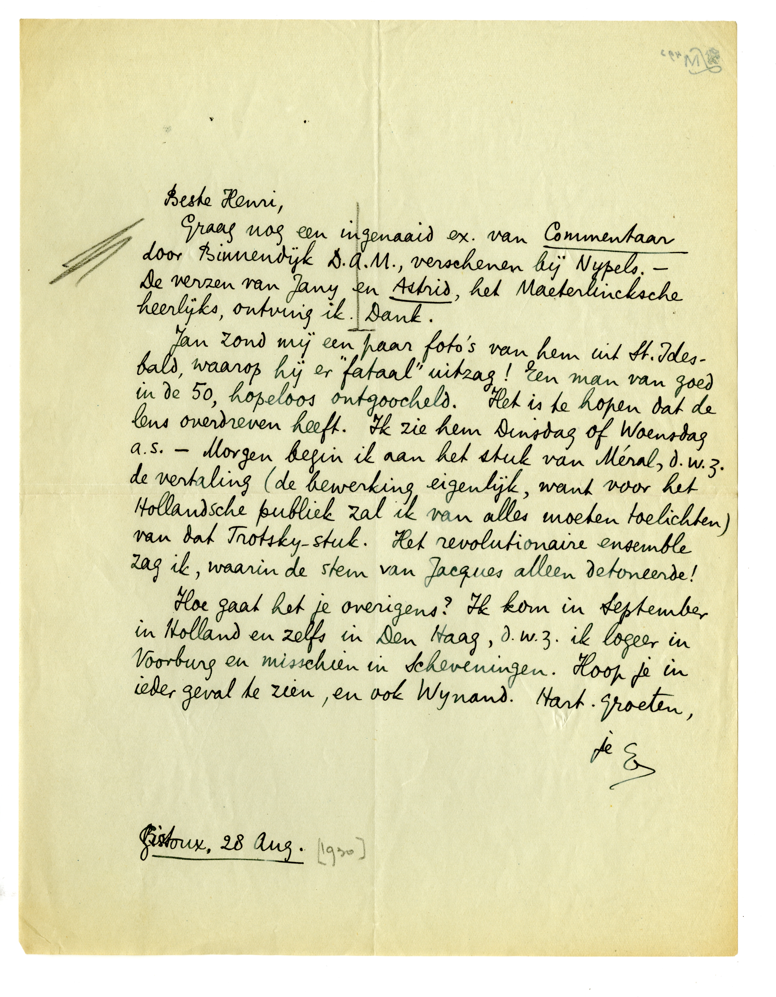 Jan zond mij een paar foto's van hem uit St. Idesbald, waarop hij er ‘fataal’ uitzag! Een man van goed in de 50, hopeloos ontgoocheld. Het is te hopen dat de lens overdreven heeft. Ik zie hem Dinsdag of Woensdag a.s. - Morgen begin ik aan het stuk van Méral, d.w.z. de vertaling (de bewerking eigenlijk, want voor het Hollandsche publiek zal ik van alles moeten toelichten) van dat Trotsky-stuk. Het revolutionaire ensemble1962 zag ik, waarin de stem van Jacques alleen detoneerde!