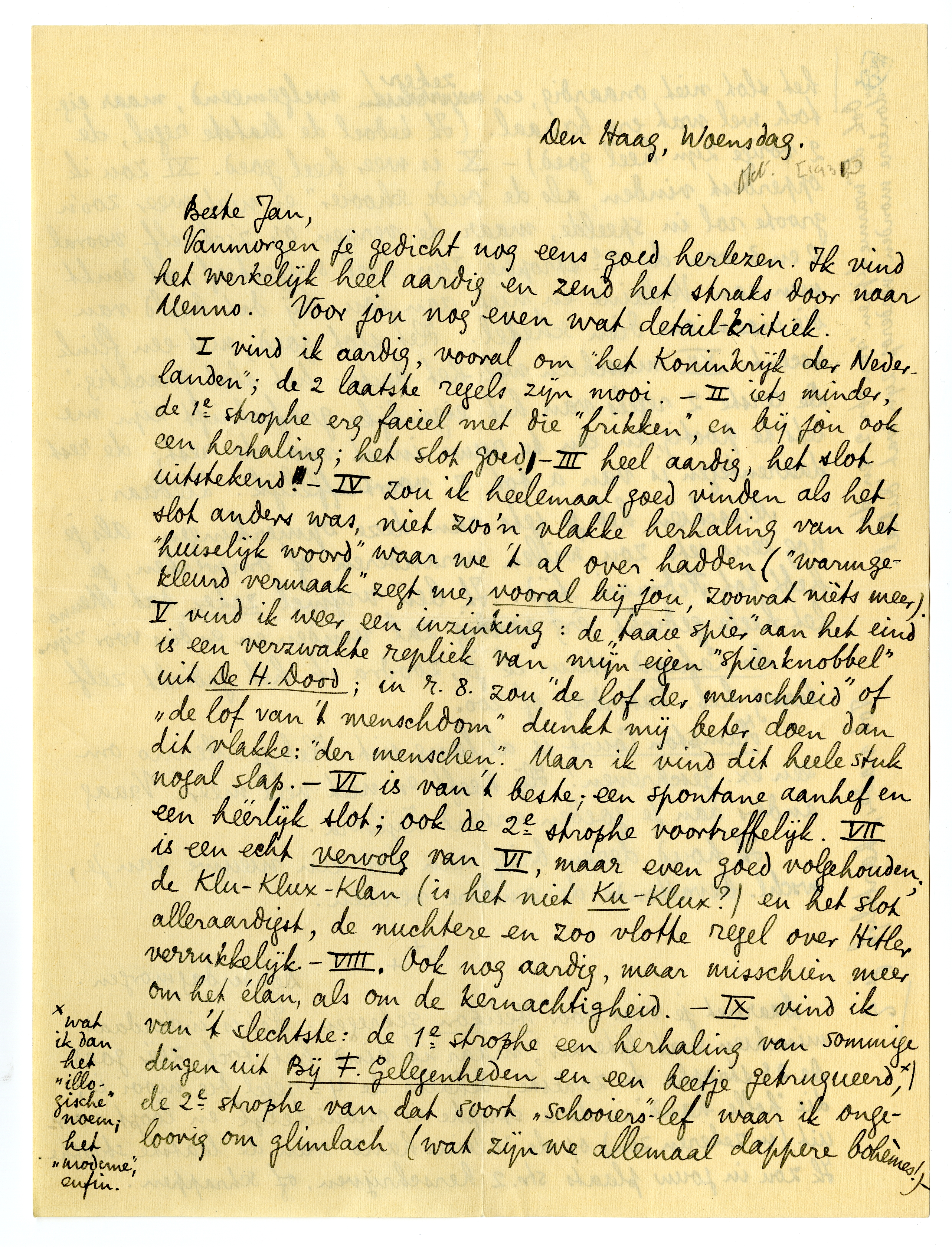 I vind ik aardig, vooral om ‘het Koninkrijk der Nederlanden’1997; de 2 laatste regels zijn mooi. - II iets minder, de 1e strophe erg faciel met die ‘frikken’, en bij jou ook een herhaling; het slot goed. - III heel aardig, het slot uitstekend. - IV zou ik heelemaal goed vinden als het slot anders was, niet zoo'n vlakke herhaling van het ‘huiselijk woord’ waar we 't al over hadden, (‘warmgekleurd vermaak’ zegt me, vooral bij jou, zoowat nièts meer) V vind ik weer een inzinking: de ‘taaie spier’ aan het eind is een verzwakte repliek van mijn eigen ‘spierknobbel’ uit De H. Dood1998; in r. 8 zou ‘de lof der menschheid’ of ‘de lof van 't menschdom’ dunkt mij beter doen dat dit vlakke: ‘der menschen’. Maar ik vind dit heele stuk nogal slap. - VI is van 't beste; een spontane aanhef en een héérlijk slot; ook de 2e strophe voortreffelijk. VII is een echt vervolg van VI, maar even goed volgehouden, de Klu-Klux-Klan (is het niet Ku-Klux?) en het slot alleraardigst, de nuchtere en zoo vlotte regel over Hitler1999 verrukkelijk. - VIII. Ook nog aardig, maar misschien meer om het élan, als om de kernachtigheid. - IX vind ik van 't slechtste: de 1e strophe een herhaling van sommige dingen uit Bij F. Gelegenheden en een beetje getruqueerd,* de 2e strophe van dat soort ‘schooiers’-lef waar ik ongeloovig om glimlach (wat zijn we allemaal dappere bohèmes), het slot niet onaardig, en zeker welgemeend, maar eig. toch wel wat erg banaal. (Ik bedoel de laatste regel, de 2 vorige zijn heel goed.) - X is weer heel goed. XI zou ik opperbest vinden, als de ‘oude schooier’ er niet weer zoo'n groote rol in speelde, maar de verzen op zichzelf, vooral 2 en 3 van de 2e strophe zijn heel suggestief; al denkt men aan Verlaine en niet aan jou bij dat beeld van die maan om dien schedel. Het slot goed, met een flink accent. XII misschien wel het beste: het slot prachtig. De eerste 2 regels van het eigenlijke grafschrift zijn me iets te pootig. en een te ruwe inzet voor de rest; de rest daarentegen is van a tot z voortreffelijk. Ziedaar.