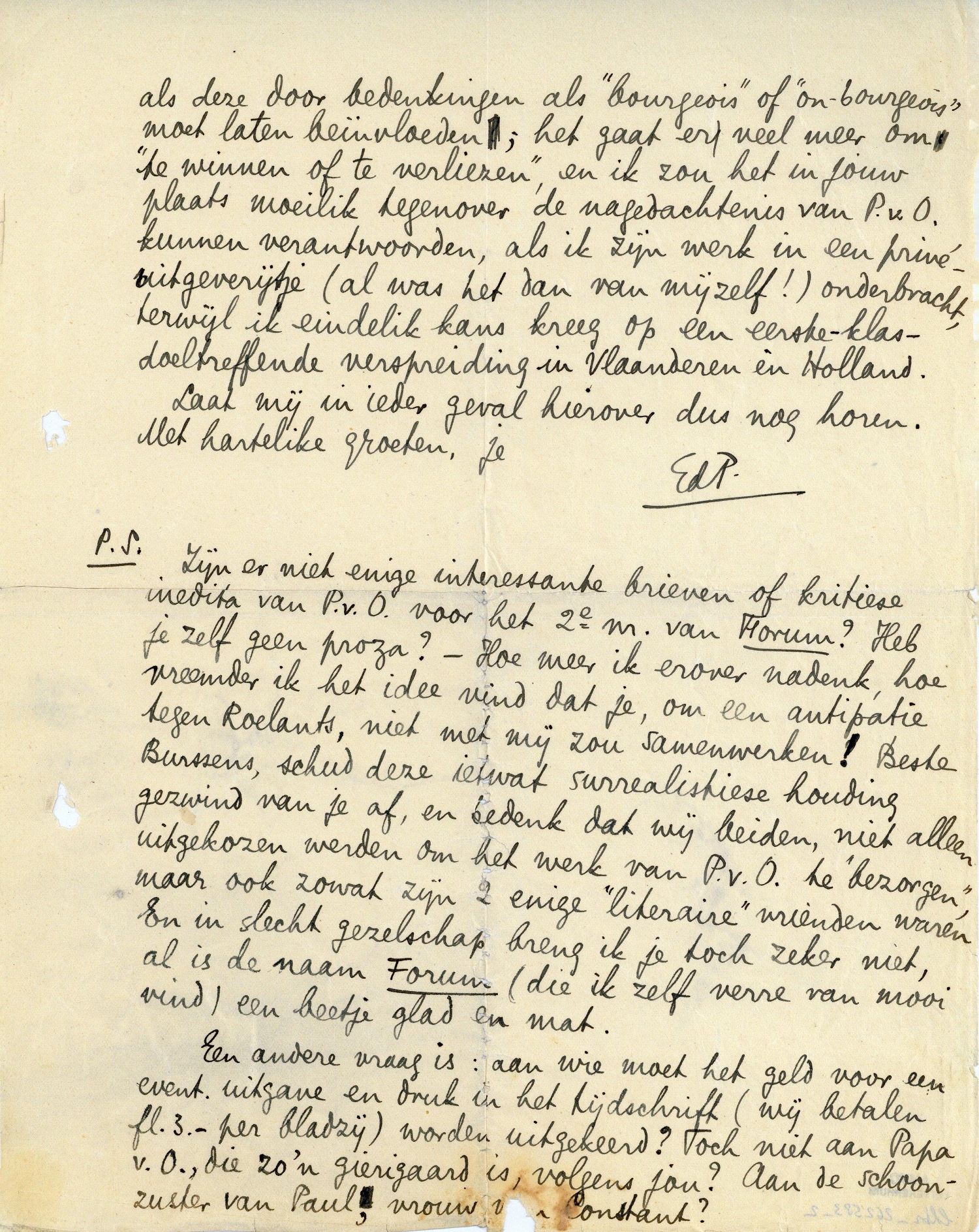 P.S. Zijn er niet enige interessante brieven of kritiese inedita van P.v.O. voor het 2e nr. van Forum? Heb je zelf geen proza? - Hoe meer ik erover nadenk, hoe vreemder ik het idee vind dat je, om een antipatie tegen Roelants, niet met mij zou samenwerken! Beste Burssens, schud deze ietwat surrealistiese houding gezwind van je af, en bedenk dat wij beiden, niet alleen uitgekozen werden om het werk van P.v.O. te ‘bezorgen’, maar ook zo wat zijn 2 enige ‘literaire’ vrienden waren. En in slecht gezelschap breng ik je toch zeker niet, al is de naam Forum (die ik zelf verre van mooi vind) een beetje glad en mat.