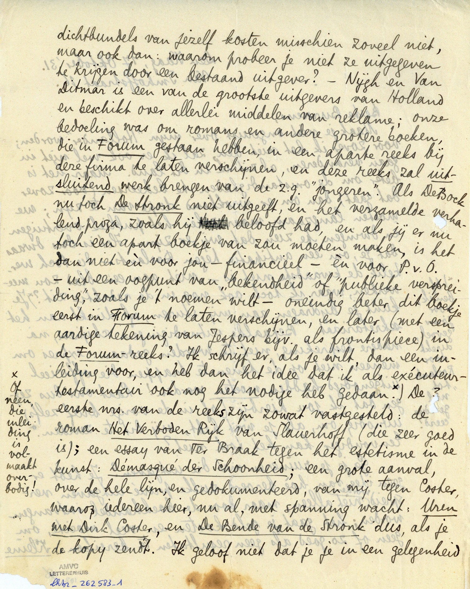 Ga je je ruïneren met die uitgaven? Je hebt er geen idee van hoè beroerd zulke privé-uitgaven verspreid worden niet alleen, maar door de boekhandel ontvangen worden; het gaat je geld kosten en veel moeite, om geen of zo goed als geen resultaten te bereiken. Kleine dichtbundels van jezelf kosten misschien zoveel niet, maar ook dan: waarom probeer je niet ze uitgegeven te krijgen door een bestaand uitgever? - Nijgh en Van Ditmar is een van de grootste uit-gevers van Holland en beschikt over allerlei middelen van reklame; onze bedoeling was om romans en andere grotere boeken, die in Forum gestaan hebben, in een aparte reeks bij deze firma te laten verschijnen, en deze reeks zal uitsluitend werk brengen van de z.g. ‘jongeren’. Als De Bock nu toch De Stronk niet uitgeeft, en het verzamelde verhalend proza, zoals hij beloofd had, en als jij er nu toch een apart boekje van zou moeten maken, is het dan niet èn voor jou - financieel - èn voor P.v.O. - uit een oogpunt van ‘bekendheid’ of ‘publieke verspreiding’, zoals je 't noemen wilt - oneindig beter dit boekje eerst in Forum te laten verschijnen, en later (met een aardige tekening van Jespers bijv. als frontispiece) in de Forum-reeks? Ik schrijf er, als je wilt, dan een inleiding voor, en heb dan het idee dat ik als exécuteur-testamentair ook nog het nodige heb gedaan.* De 3 eerste nrs. van de reeks zijn zowat vastgesteld: de roman Het Verboden Rijk van Slauerhoff (die zeer goed is); een essay van Ter Braak tegen het estetisme in de kunst: Démasqué der Schoonheid; een grote aanval, over de hele lijn, en gedokumenteerd, van mij tegen Coster, waarop iedereen hier, nu al, met spanning wacht: Uren met Dirk Coster, en De Bende van de Stronk dus, als je de kopy zendt. Ik geloof niet dat je je in een gelegenheid als deze door bedenkingen als ‘bourgeois’ of ‘on-bourgeois’ moet laten beïnvloeden; het gaat er veel meer om ‘te winnen of te verliezen’, en ik zou het in jouw plaats moeilik tegenover de nagedachtenis van P.v.O. kunnen verantwoorden, als ik zijn werk in een privé-uitgeverijtje (al was het dan van mijzelf!) onderbracht, terwijl ik eindelik kans kreeg op een eerste-klas-doeltreffende verspreiding in Vlaanderen èn Holland.