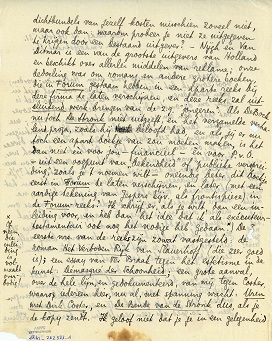 Maak je niet ongerust over mijn ‘Hollander’ worden; voor zover ik het niet bèn, zal ik er ook wel niet in gaan veranderen, al zit ik in dit land. Maar het is beter om de omstandigheden te beheersen (voor zover dat gaat) dan om er wrokkend dupe van te zijn; we moeten langzaam maar zeker het publiek overtuigen en dwingen te zien dat wij er zijn. Het is dus dwaas dat je, om een antipatie tegen Roelants - die toch werkelik de kwaadste niet is - niet aan een blad zou meewerken, waar ik toch ook nog in de redaktie zit?* Je kunt je bijdragen aan mij sturen, of direkt aan het sekretariaat. Bepaalde uitnodigingen schijnen, na nadere bespreking, niet te worden gedaan: expres om mensen niet op de tenen te trappen die officieel uitgenodigd hadden moeten worden! Laat ons dus zeggen dat ik jou hierbij (of in de vorige brief zelfs) uitnodig om, als je wat hebt, mij dit te zenden. Eenvoudiger kan het toch niet?