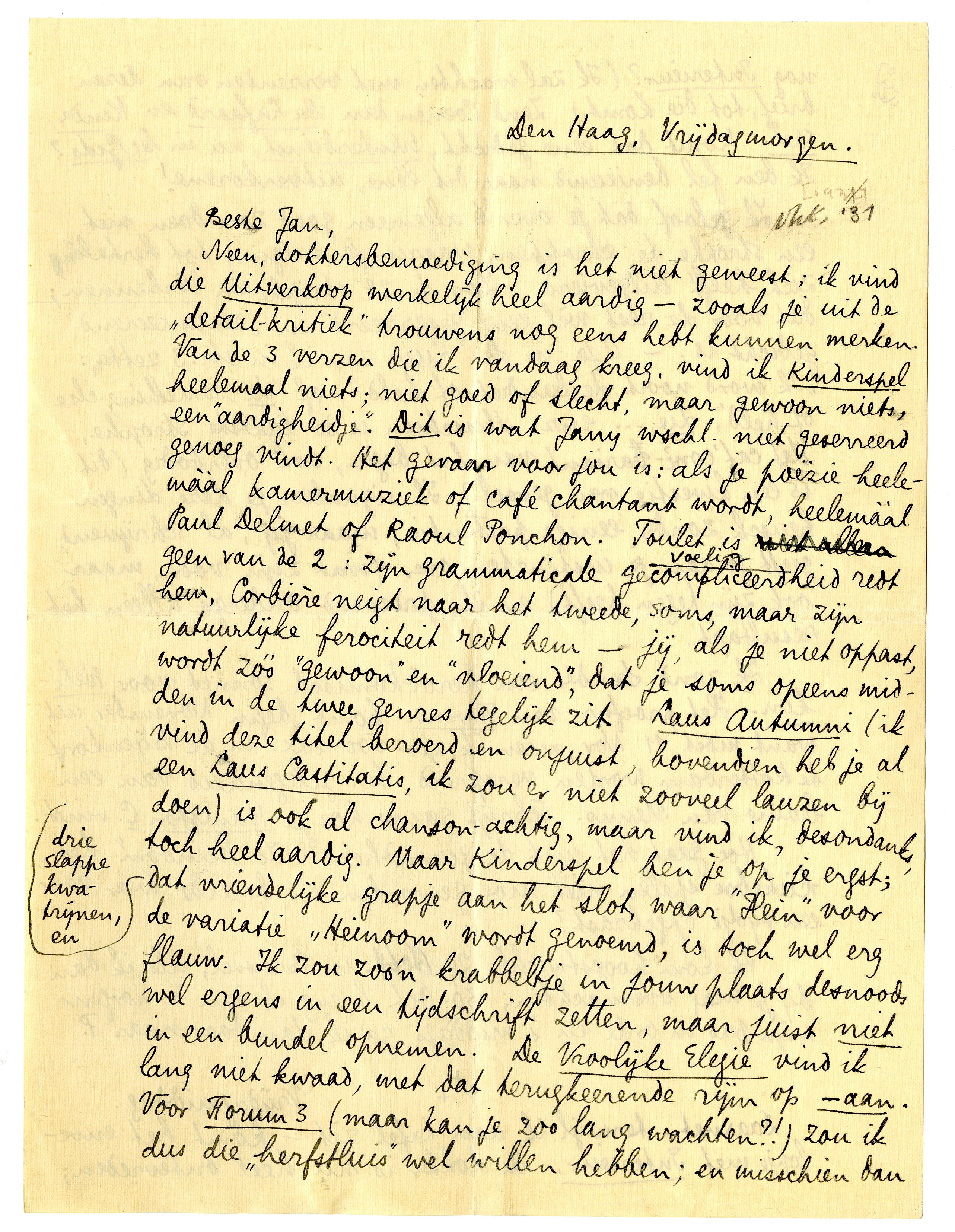 Neen, doktersbemoediging is het niet geweest; ik vind die Uitverkoop2006 werkelijk heel aardig - zooals je uit de ‘detail-kritiek’ trouwens nog eens hebt kunnen merken. Van de 3 verzen die ik vandaag kreeg, vind ik Kinderspel heelemaal niets; niet goed of slecht, maar gewoon niets, een ‘aardigheidje’. Dit is wat Jany wschl. niet geserreerd genoeg vindt. Het gevaar voor jou is: als je poëzie heelemààl kamermuziek of café chantant wordt, heelemààl Paul Delmat of Raoul Ponchon.2007 Toulet is geen van de 2: zijn grammaticale ge voelig/compliceerd heid redt hem, Corbière neigt naar het tweede, soms, maar zijn natuurlijke ferociteit redt hem - jij, als je niet oppast, wordt zóó ‘gewoon’ en ‘vloeiend’, dat je soms opeens midden in de twee genres tegelijk zit. Laus Autumni (ik vind deze titel beroerd en onjuist, bovendien heb je al een Laus Castitatis, ik zou er niet zooveel lauzen bij doen) is ook al chanson-achtig, maar vind ik, desondanks, toch heel aardig. Maar Kinderspel ben je op je ergst; drie slappe kwatrijnen, en dat vriendelijke grapje aan het slot, waar ‘Hein’2008 voor de variatie ‘Heinoom’ wordt genoemd, is toch wel erg flauw. Ik zou zoo'n krabbeltje in jouw plaats desnoods wel ergens in een tijdschrift zetten, maar juist niet in een bundel opnemen. De Vroolijke Elegie vind ik lang niet kwaad, met dat terugkeerende rijm op -aan. Voor Forum 32009 (maar kan je zoo lang wachten?!) zou ik dus die ‘herfstluis’ wel willen hebbenen; en misschien dan nog Interieur? (Ik zal wachten met verzenden van dezen brief, tot die komt.) Zend Coenen dan De Lafaard en Kinderspel.2010 Komt dat ééne gedicht, Winterdienst, nu in De Gids? Ik ben fel benieuwd naar dit ééne, uitverkorene!