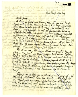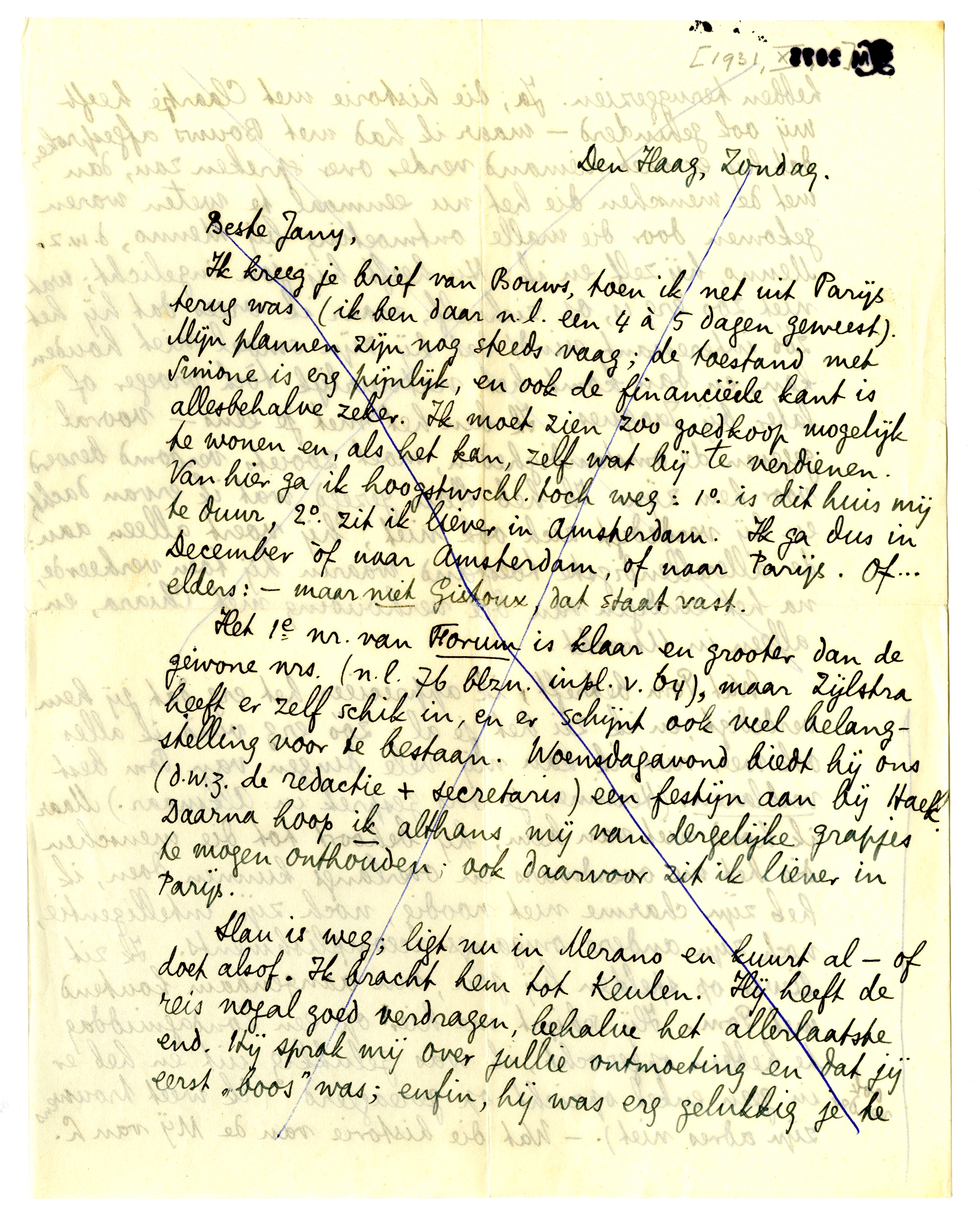 Het 1e nr. van Forum is klaar en grooter dan de gewone nrs. (n.l. 76 blzn. inpl.v. 64), maar Zijlstra heeft er zelf schik in, en er schijnt ook veel belangstelling voor te bestaan. Woensdagavond biedt hij ons (d.w.z. de redactie + secretaris) een festijn aan bij Haek. Daarna hoop ik althans mij van dergelijke grapjes te mogen onthouden; ook daarvoor zit ik liever in Parijs.