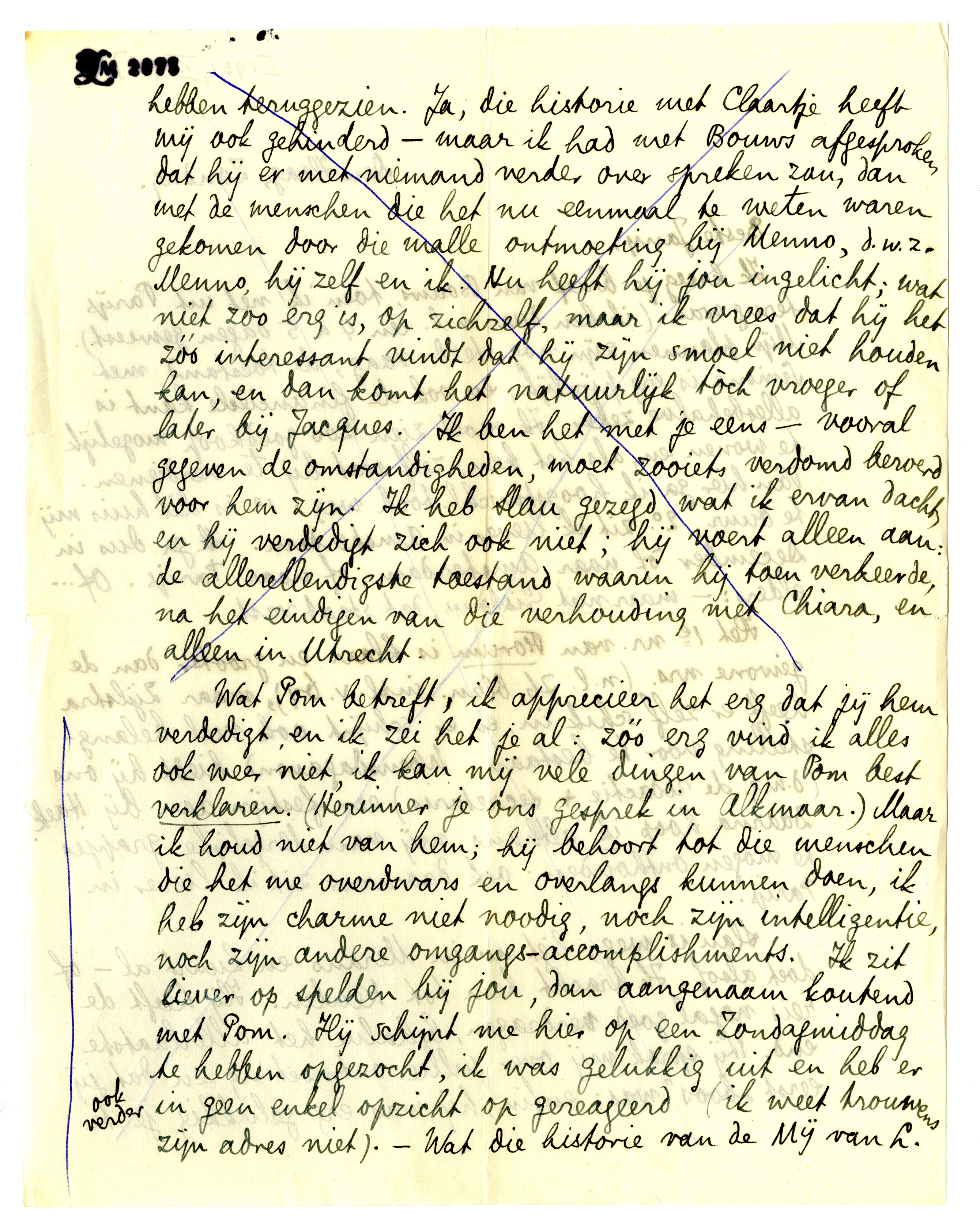 Slau is weg; ligt nu in Merano en kuurt al - of doet alsof. Ik bracht hem tot Keulen. Hij heeft de reis nogal goed verdragen, behalve het allerlaatste end. Hij sprak mij over jullie ontmoeting en dat jij eerst ‘boos’ was; enfin, hij was erg gelukkig je te hebben teruggezien. Ja, die historie met Claartje heeft mij ook gehinderd - maar ik had met Bouws afgesproken dat hij er met niemand verder over spreken zou, dan met de menschen die het nu eenmaal te weten waren gekomen door die malle ontmoeting bij Menno, d.w.z. Menno, hijzelf en ik. Nu heeft hij jou ingelicht; wat niet zoo erg is, op zichzelf, maar ik vrees dat hij het zóó interessant vindt dat hij zijn smoel niet houden kan, en dan komt het natuurlijk tòch vroeger of later bij Jacques. Ik ben het met je eens - vooral gegeven de omstandigheden, moet zooiets verdomd beroerd voor hem zijn. Ik heb Slau gezegd wat ik ervan dacht, en hij verdedigt zich ook niet; hij voert alleen aan: de allerellendigste toestand waarin hij toen verkeerde, na het eindigen van die verhouding met Chiara,2020 en alleen in Utrecht.