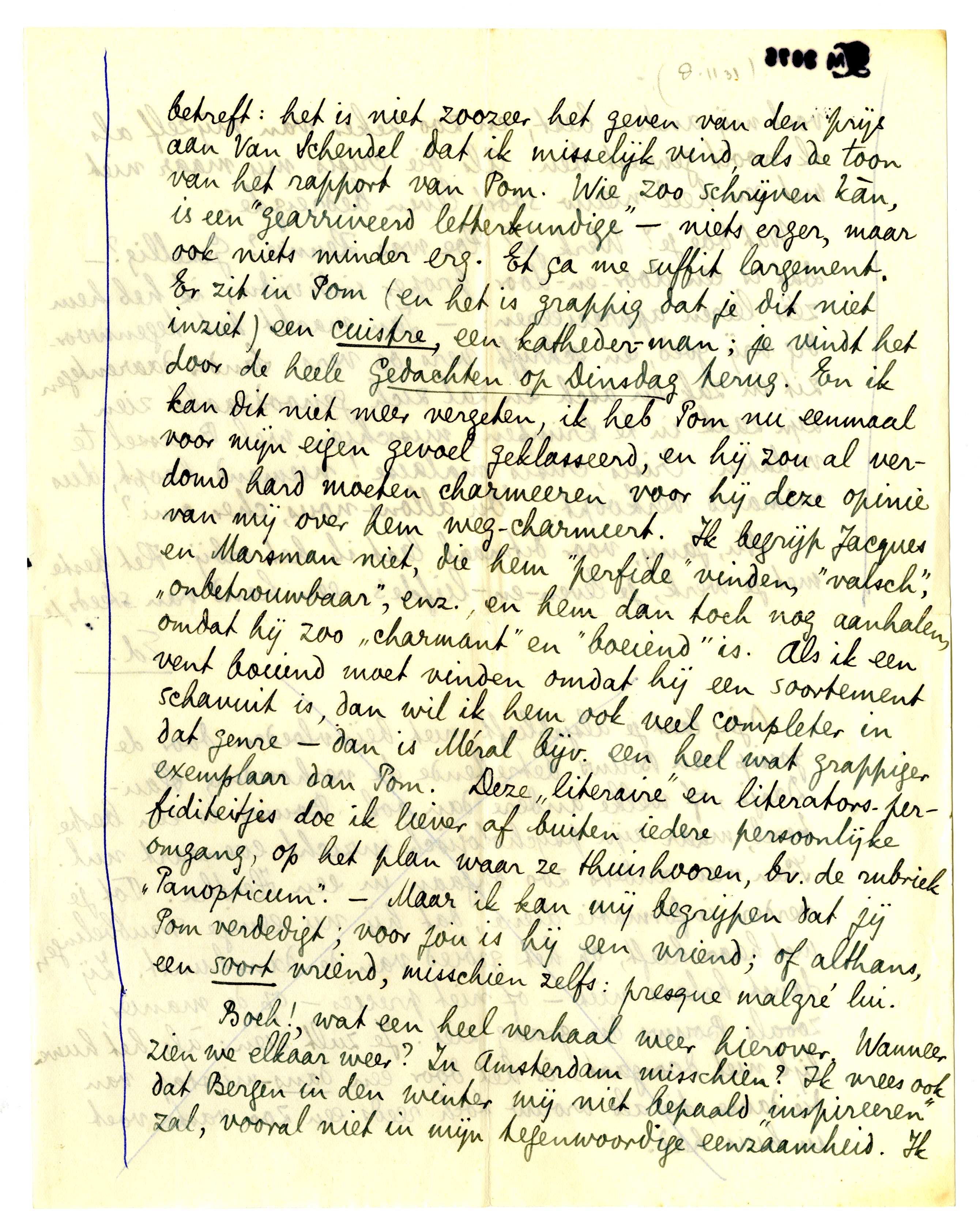 Wat Pom betreft, ik apprecieer het erg dat jij hem verdedigt, en ik zei het je al: zóó erg vind ik alles ook weer niet, ik kan mij vele dingen van Pom best verklaren. (Herinner je ons gesprek in Alkmaar.) Maar ik houd niet van hem; hij behoort tot die menschen die het me overdwars en overlangs kunnen doen, ik heb zijn charme niet noodig, noch zijn intelligentie, noch zijn andere omgangs-accomplishments. Ik zit liever op spelden bij jou, dan aangenaam koutend met Pom. Hij schijnt me hier op een Zondagmiddag te hebben opgezocht, ik was gelukkig uit en heb er ook verder in geen enkel op-zicht op gereageerd (ik weet trouwens zijn adres niet). - Wat die historie van de Mij van L. betreft: het is niet zoozeer het geven van den prijs aan Van Schendel dat ik misselijk vind, als de toon van het rapport van Pom. Wie zoo schrijven kàn, is een ‘gearriveerd letterkundige’ - niets erger, maar ook niets minder erg. Et ça me suffit largement. Er zit in Pom (en het is grappig dat je dit niet inziet) een cuistre, een katheder-man; je vindt het door de heele Gedachten op Dinsdag terug. En ik kan dit niet meer vergeten, ik heb Pom nu eenmaal voor mijn eigen gevoel geklasseerd, en hij zou al verdomd hard moeten charmeeren voor hij deze opinie van mij over hem weg-charmeert. Ik begrijp Jacques en Marsman niet, die hem ‘perfide’ vinden, ‘valsch’, ‘onbetrouwbaar’, enz., en hem dan toch nog aanhalen, omdat hij zoo ‘charmant’ en ‘boeiend’ is. Als ik een vent boeiend moet vinden omdat hij een soortement schavuit is, dan wil ik hem ook veel completer in dat genre - dan is Méral bijv. een heel wat grappiger exemplaar dan Pom. Deze ‘literaire’ en literators-perfiditeitjes doe ik liever af buiten iedere persoonlijke omgang, op het plan waar ze thuis hooren, bv. de rubriek ‘Panopticum’. - Maar ik kan mij begrijpen dat jij Pom verdedigt; voor jou is hij een vriend; of althans, een soort vriend, misschien zelfs: presque malgré lui.