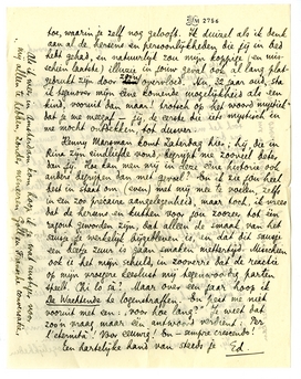 Jij, hoû je goed! Ik wensch je alle mogelijkheden toe, waarin je zelf nog gelooft. Ik duizel als ik denk aan al de hersens en persoonlijkheden die jij in bed hebt gehad, en natuurlijk zou mijn koppige (en misschien laatste) illuzie in jouw geval ook al lang platgedrukt zijn door zoo'n overvloed. Nu, 32 jaar oud, sta ik tegenover mijn ééne komende mogelijkheid als een kind, vooruit dan maar! trotsch op het woord ‘mystiek’ dat je me meegaf - jij, de eerste die iets mystisch in me mocht ontdekken, tot dusver.