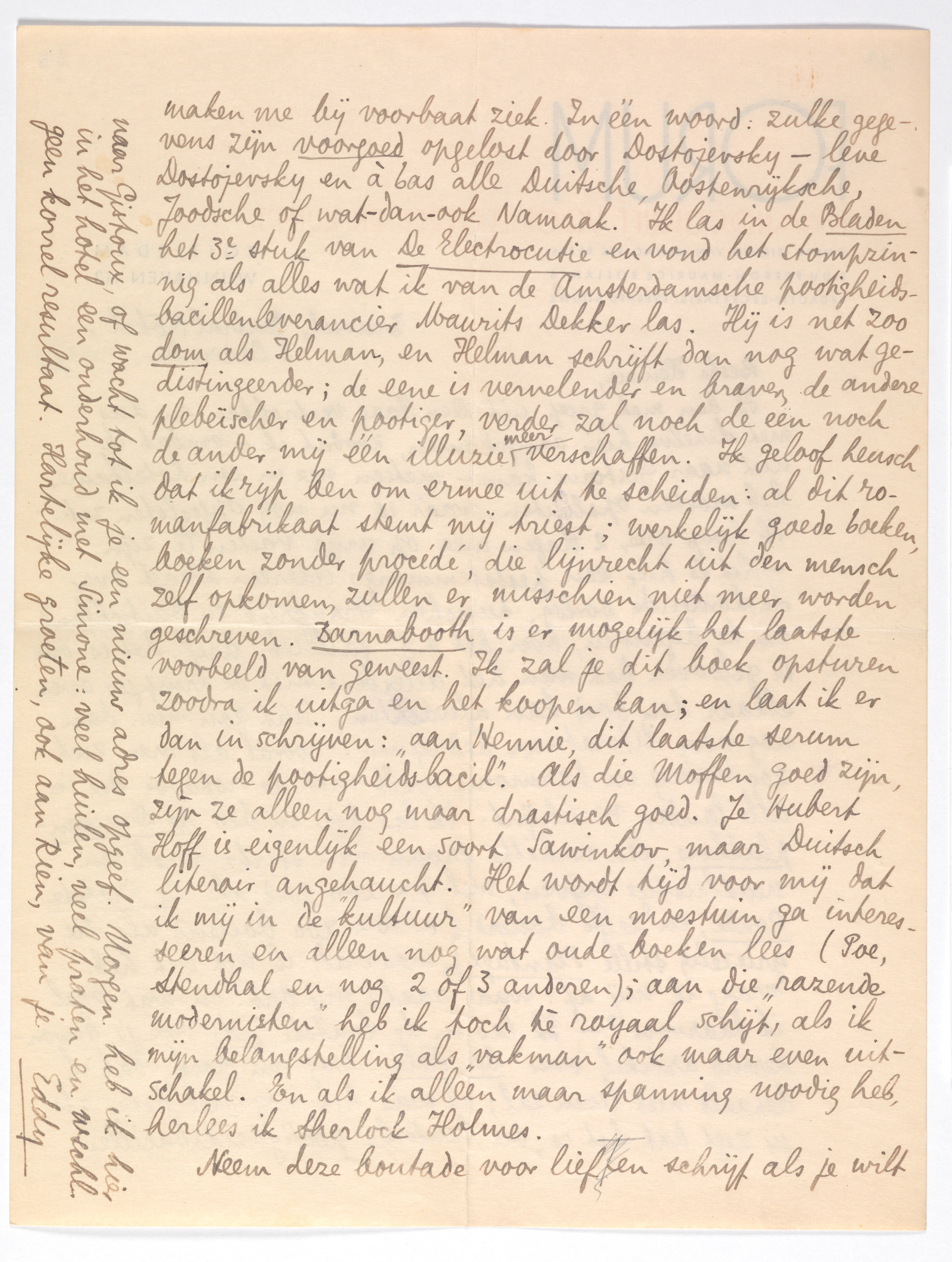 Ik ben met griep uit Den Haag vertrokken en dus met dezelve hier aangekomen, zoodat ik - omdat ik niet naar Gistoux kan - meteen me in een hotelkamer heb moeten opsluiten, waar ik nu nog opgesloten zit. Ik hoop over 2 dagen weer op vrije voeten te zijn. - Het is hier een peststemming: iedereen klaagt over de komende oorlog, tusschen Frankrijk en Duitschland om te beginnen, over het a.s. failliet; bref, het is om te gelooven dat men het allerbest met de armpjes over elkaar den dood kan afwachten. Wat zou men dan nog voor literatuur bedrijven? vooral als men zich zoo weinig in harmonie voelt met de rotzooi die in alle landen verschijnt. Ik las hier in bed De Druivenplukkers, één verhitte droom van sterke kerels en neuklustige wijven, wel 4 × zoo goed als De Laatste Ronde, en zelfs boeiend (o! 10 × zoo boeiend als die griezelig stille Plantage), maar als ik het uit heb, vraag ik mij af: waar raakt mij dat? en wat voel ik daarvoor? - Ik las in de laatste Gids ook je bewonderend artikel over Der Held.2036 Nog een boek, dat ik bepaald niet lezen zal; al was het nog veel beter als jij zegt dat het is, die Duitsche pootigheidsbacillen maken me bij voorbaat ziek. In één woord: zulke gegevens zijn voorgoed opgelost door Dostojevsky - leve Dostojevsky en à bas alle Duitsche, Oostenrijksche, Joodsche of wat-dan-ook Namaak. Ik las in de Bladen het 3e stuk van De Electrocutie2037 en vond het stompzinnig als alles wat ik van de Amsterdamsche pootigheidsbacillenleverancier Maurits Dekker las. Hij is net zoo dom als Helman, en Helman schrijft dan nog wat gedistingeerder; de eene is vervelender en braver, de andere plebeïscher en pootiger, verder zal noch de een noch de ander mij één illuzie meer verschaffen. Ik geloof heusch dat ik rijp ben om ermee uit te scheiden: al dit romanfabrikaat stemt mij triest; werkelijk goede boeken, boeken zonder procédé, die lijnrecht uit den mensch zelf opkomen, zullen er misschien niet meer worden geschreven. Barnabooth is er mogelijk het laatste voorbeeld van ge-weest. Ik zal je dit boek opsturen zoodra ik uitga en het koopen kan; en laat ik er dan in schrijven: ‘aan Hennie, dit laatste serum tegen de pootigheidsbacil’. Als die Moffen goed zijn, zijn ze alleen nog maar drastisch goed. Je Hubert Hoff2038 is eigenlijk een soort Sawinkov, maar Duitsch literair angehaucht. Het wordt tijd voor mij dat ik mij in de ‘kultuur’ van een moestuin ga interesseeren en alleen nog wat oude boeken lees (Poe, Stendhal en nog 2 of 3 anderen); aan die ‘razende modernisten’ heb ik toch tè royaal schijt, als ik mijn belangstelling als ‘vakman’ ook maar even uitschakel. En als ik alleen maar spanning noodig heb, herlees ik Sherlock Holmes.