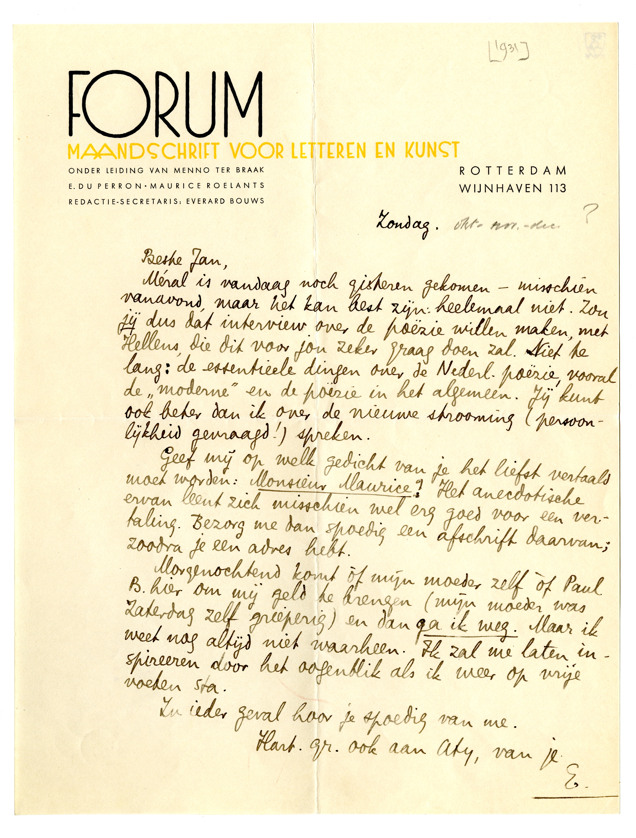 Méral is vandaag noch gisteren gekomen - misschien vanavond, maar het kan best zijn: heelemaal niet. Zou jij dus dat interview over de poëzie2040 willen maken, met Hellens, die dit voor jou zeker graag doen zal. Niet te lang: de essentieele dingen over de Nederl. poëzie, vooral de ‘moderne’ en de poëzie in het algemeen. Jij kunt ook beter dan ik over de nieuwe strooming (persoonlijkheid gevraagd!) spreken.