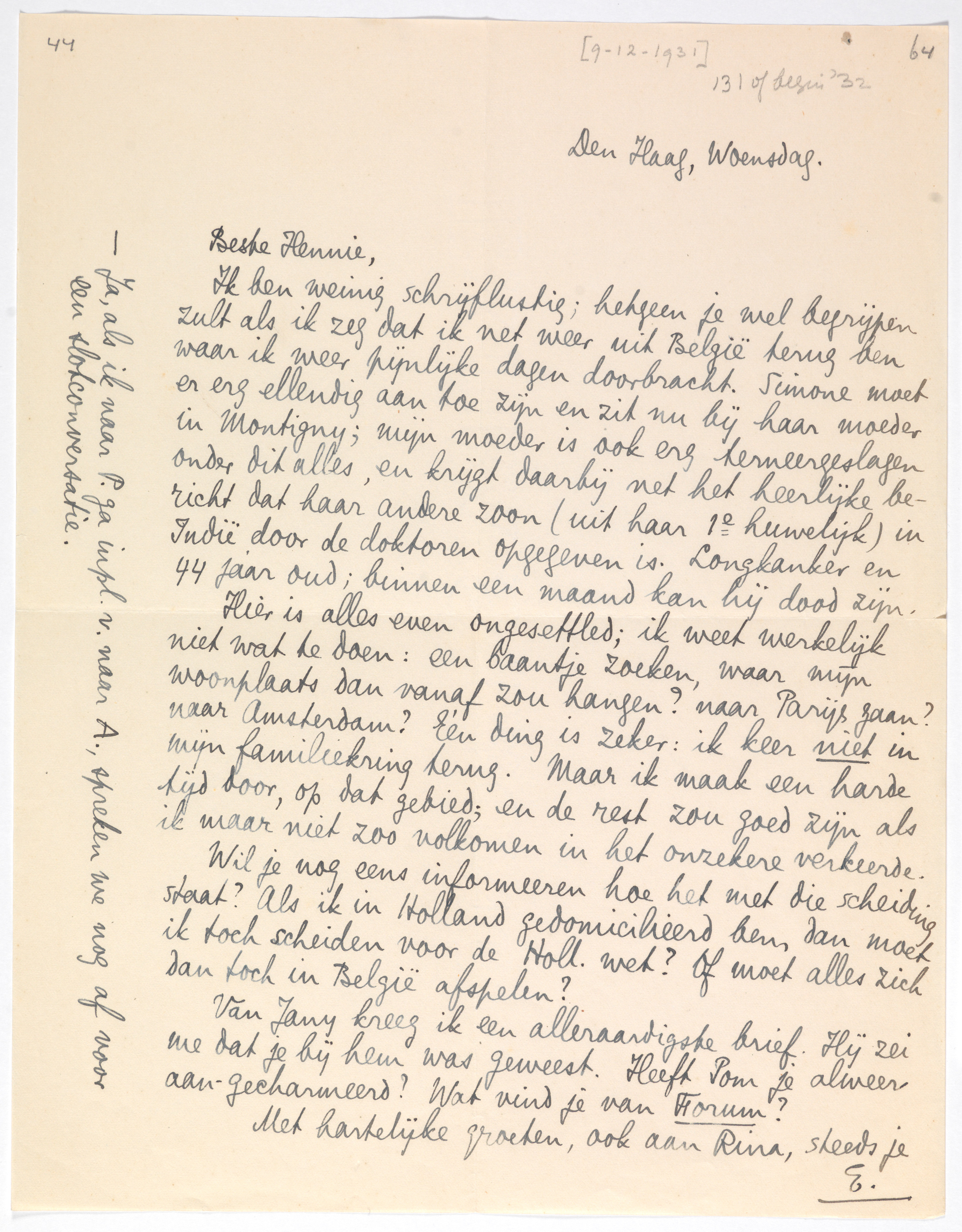 Ik ben weinig schrijflustig; hetgeen je wel begrijpen zult als ik zeg dat ik net weer uit België terug ben waar ik weer pijnlijke dagen doorbracht. Simone moet er erg ellendig aan toe zijn en zit nu bij haar moeder in Montigny; mijn moeder is ook erg terneergeslagen onder dit alles, en krijgt daarbij net het heerlijke bericht dat haar andere zoon2042 (uit haar 1e huwelijk) in Indië door de doktoren opgegeven is. Longkanker en 44 jaar oud; binnen een maand kan hij dood zijn.