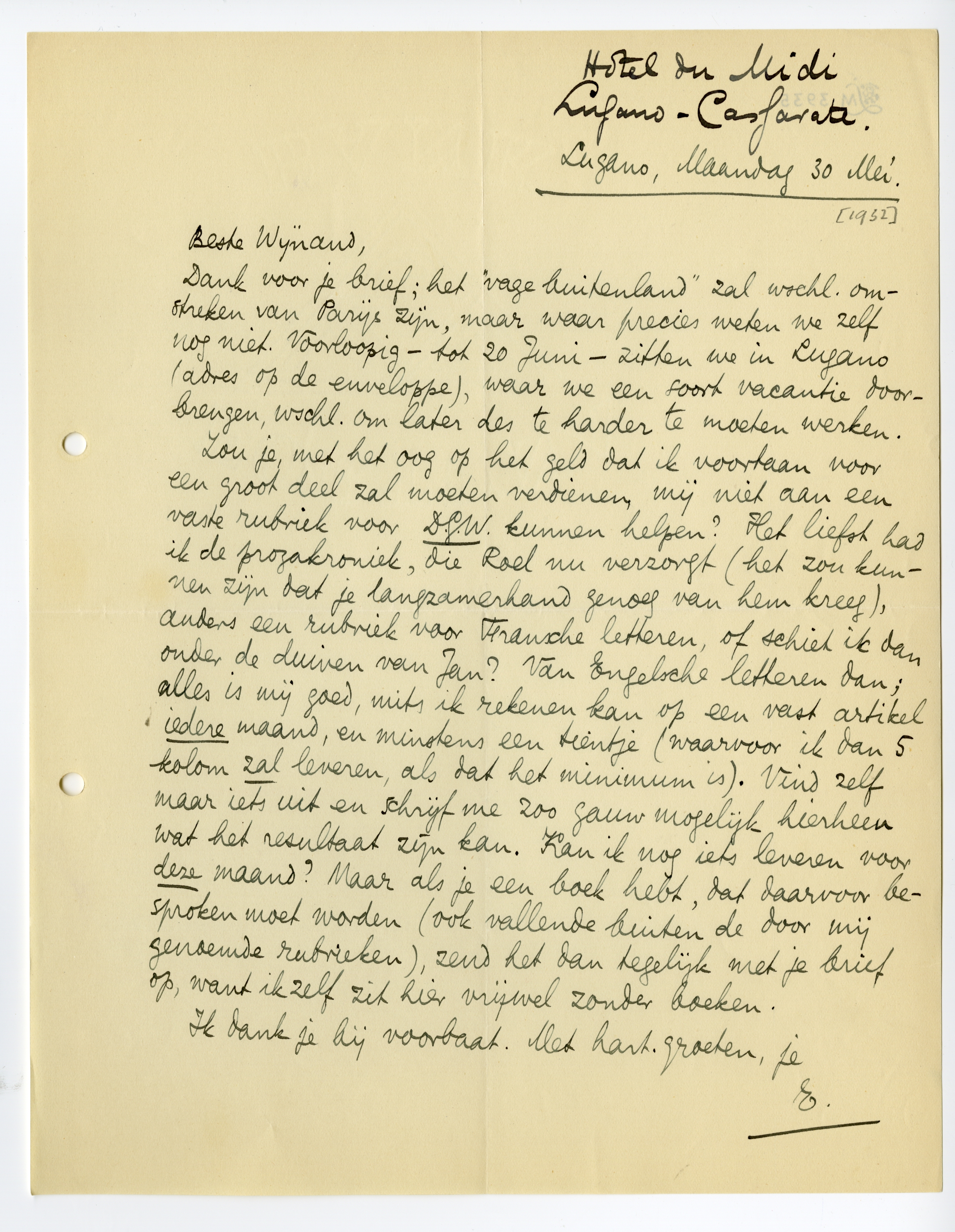 Zou je, met het oog op het geld dat ik voortaan voor een groot deel zal moeten verdienen, mij niet aan een vaste rubriek voor D.G.W. kunnen helpen? Het liefst had ik de prozakroniek, die Roel nu verzorgt (het zou kunnen zijn dat je langzamerhand genoeg van hem kreeg), anders een rubriek voor Fransche letteren, of schiet ik dan onder de duiven van Jan? Van Engelsche letteren dan; alles is mij goed, mits ik rekenen kan op een vast artikel iedere maand, en minstens een tientje (waarvoor ik dan 5 kolom zal leveren, als dat het minimum is). Vind zelf maar iets uit en schrijf me zoo gauw mogelijk hierheen wat het resultaat zijn kan. Kan ik nog iets leveren voor deze maand? Maar als je een boek hebt, dat daarvoor besproken moet worden (ook vallende buiten de door mij genoemde rubrieken), zend het dan tegelijk met je brief op, want ikzelf zit hier vrijwel zonder boeken.