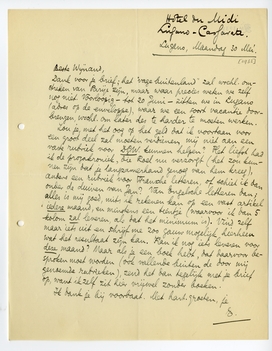 Dank voor je brief; het ‘vage buitenland’ zal wschl. omstreken van Parijs zijn, maar waar precies weten we zelf nog niet. Voorloopig - tot 20 Juni - zitten we in Lugano (adres op de enveloppe), waar we een soort vacantie doorbrengen, wschl. om later des te harder te moeten werken.