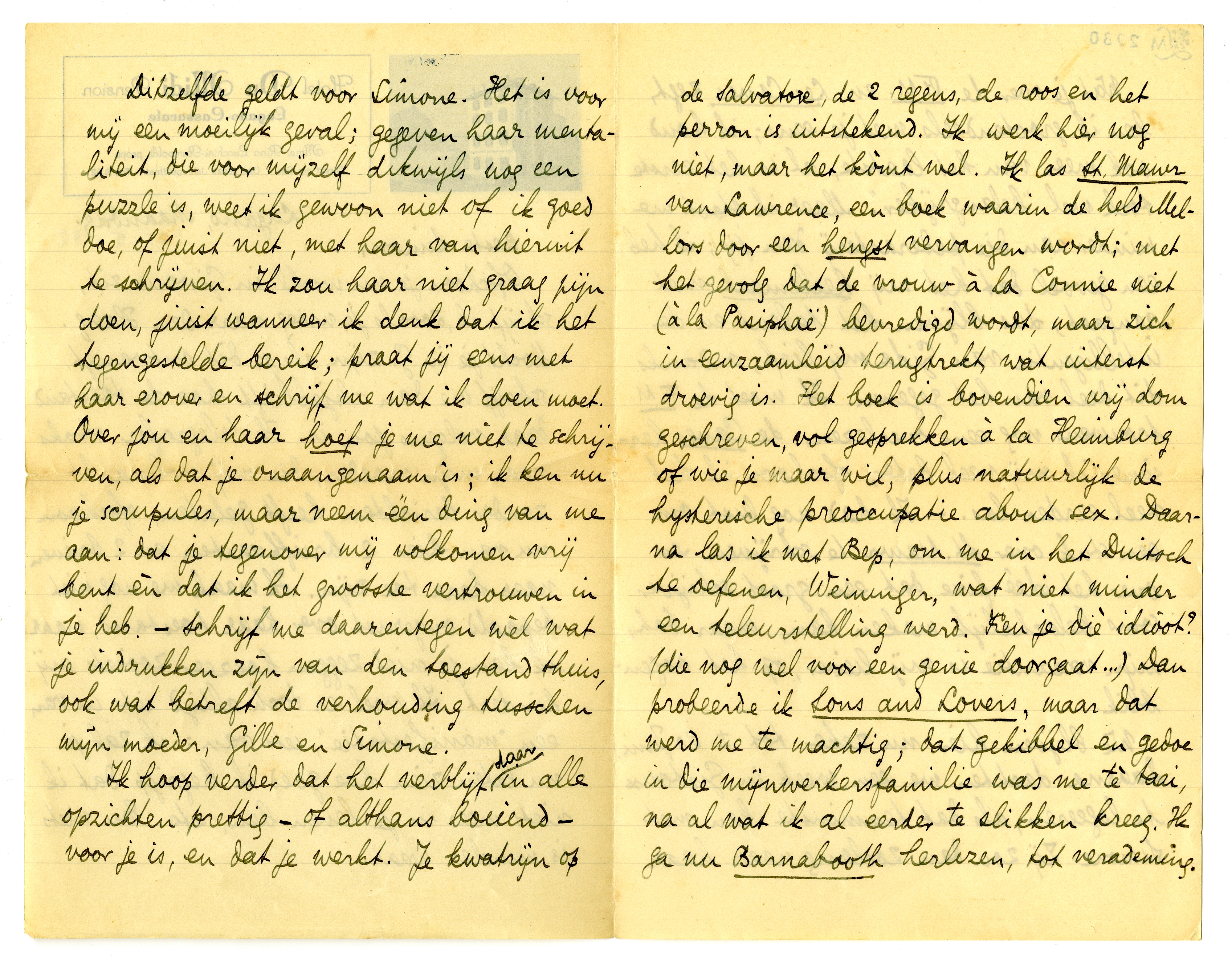 Ditzelfde geldt voor Simone. Het is voor mij een moeilijk geval; gegeven haar mentaliteit, die voor mijzelf dikwijls nog een puzzle is, weet ik gewoon niet of ik goed doe, of juist niet, met haar van hieruit te schrijven. Ik zou haar niet graag pijn doen, juist wanneer ik denk dat ik het tegengestelde bereik; praat jij eens met haar erover en schrijf me wat ik doen moet. Over jou en haar hoef je me niet te schrijven, als dat je onaangenaam is; ik ken nu je scrupules, maar neem één ding van me aan: dat je tegenover mij volkomen vrij bent èn dat ik het grootste vertrouwen in je heb. - Schrijf me daarentegen wèl wat je indrukken zijn van den toestand thuis, ook wat betreft de verhouding tusschen mijn moeder, Gille en Simone.