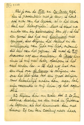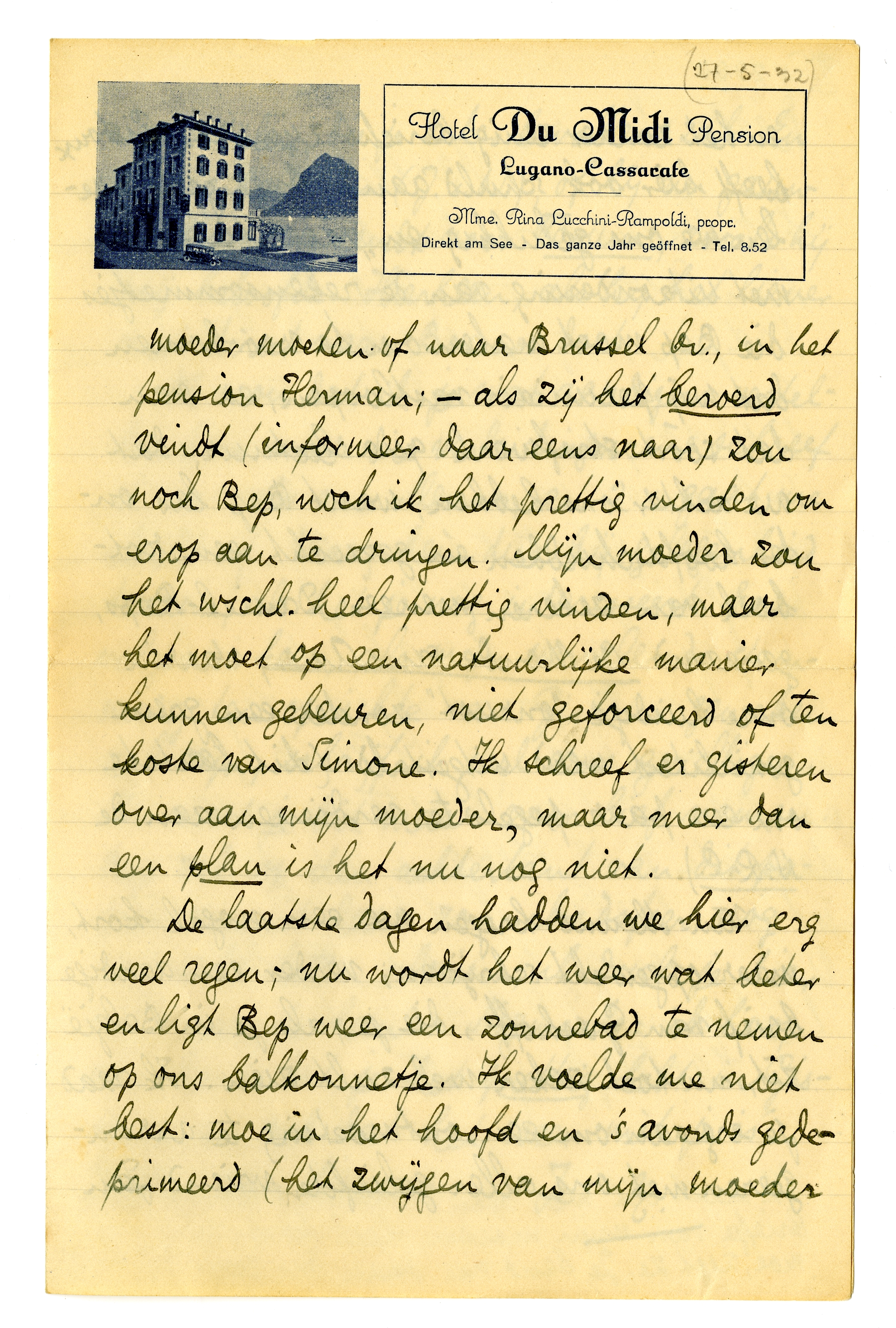 We blijven hier nu zeker tot ± 20 Juni. Daarna dachten we een week in Gistoux te logeeren, als dat tenminste kan met Simone. Zij zou dan zoolang naar haar moeder moeten of naar Brussel bv., in het pension Herman; - als zij het beroerd vindt (informeer daar eens naar) zou noch Bep, noch ik het prettig vinden om erop aan te dringen. Mijn moeder zou het wschl. heel prettig vinden, maar het moet op een natuurlijke manier kunnen gebeuren, niet geforceerd of ten koste van Simone. Ik schreef er gisteren over aan mijn moeder, maar meer dan een plan is het nu nog niet.