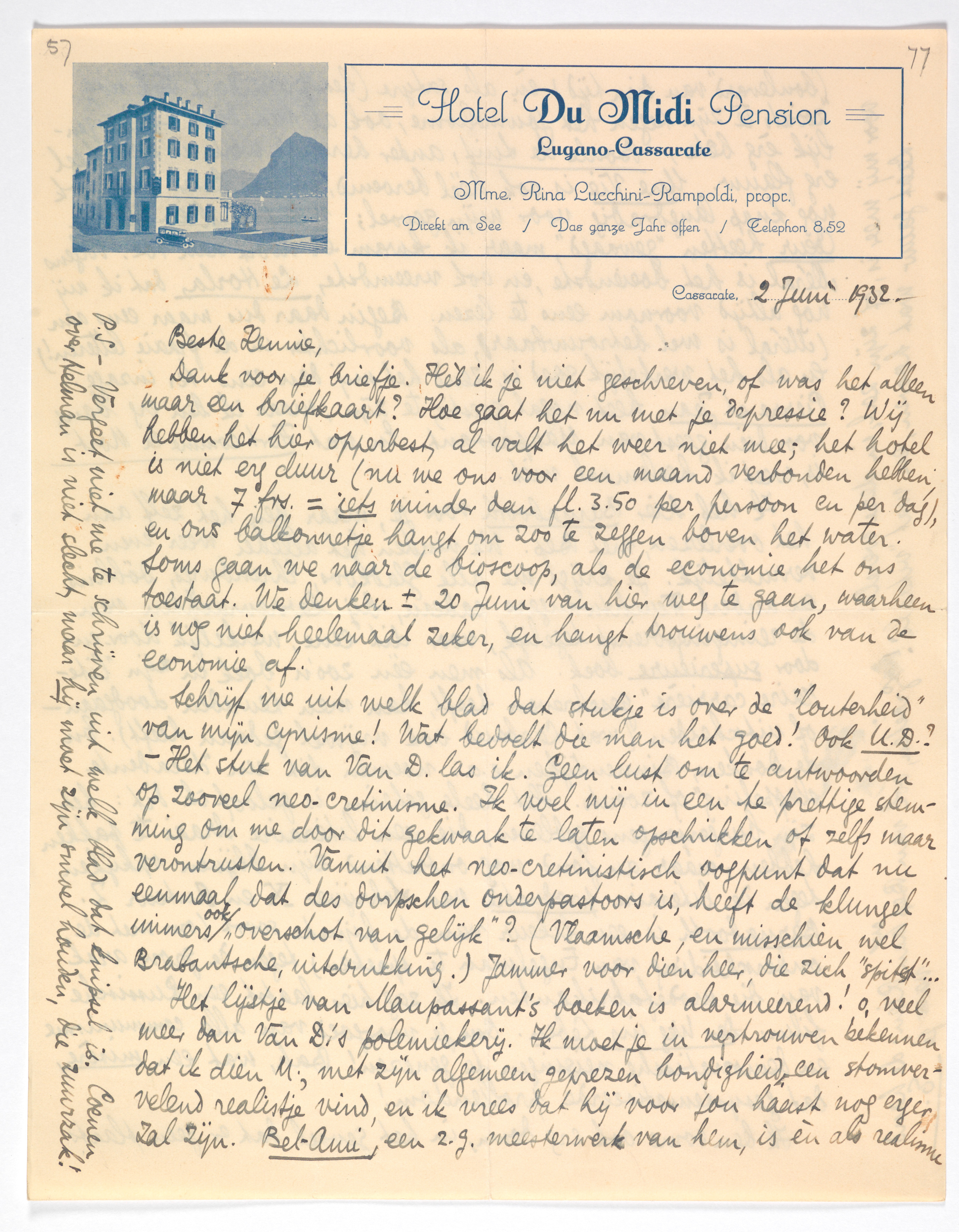 Dank voor je briefje. Hèb ik je niet geschreven, of was het alleen maar een briefkaart? Hoe gaat het nu met je depressie? Wij hebben het hier opperbest, al valt het weer niet mee; het hotel is niet erg duur (nu we ons voor een maand verbonden hebben, maar 7 frs. = iets minder dan fl. 3.50 per persoon en per dag), en ons balkonnetje hangt om zoo te zeggen boven het water. Soms gaan we naar de bioscoop, als de economie het ons toestaat. We denken ± 20Juni van hier weg te gaan, waarheen is nog niet heelemaal zeker, en hangt trouwens ook van de economie af.