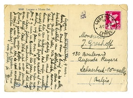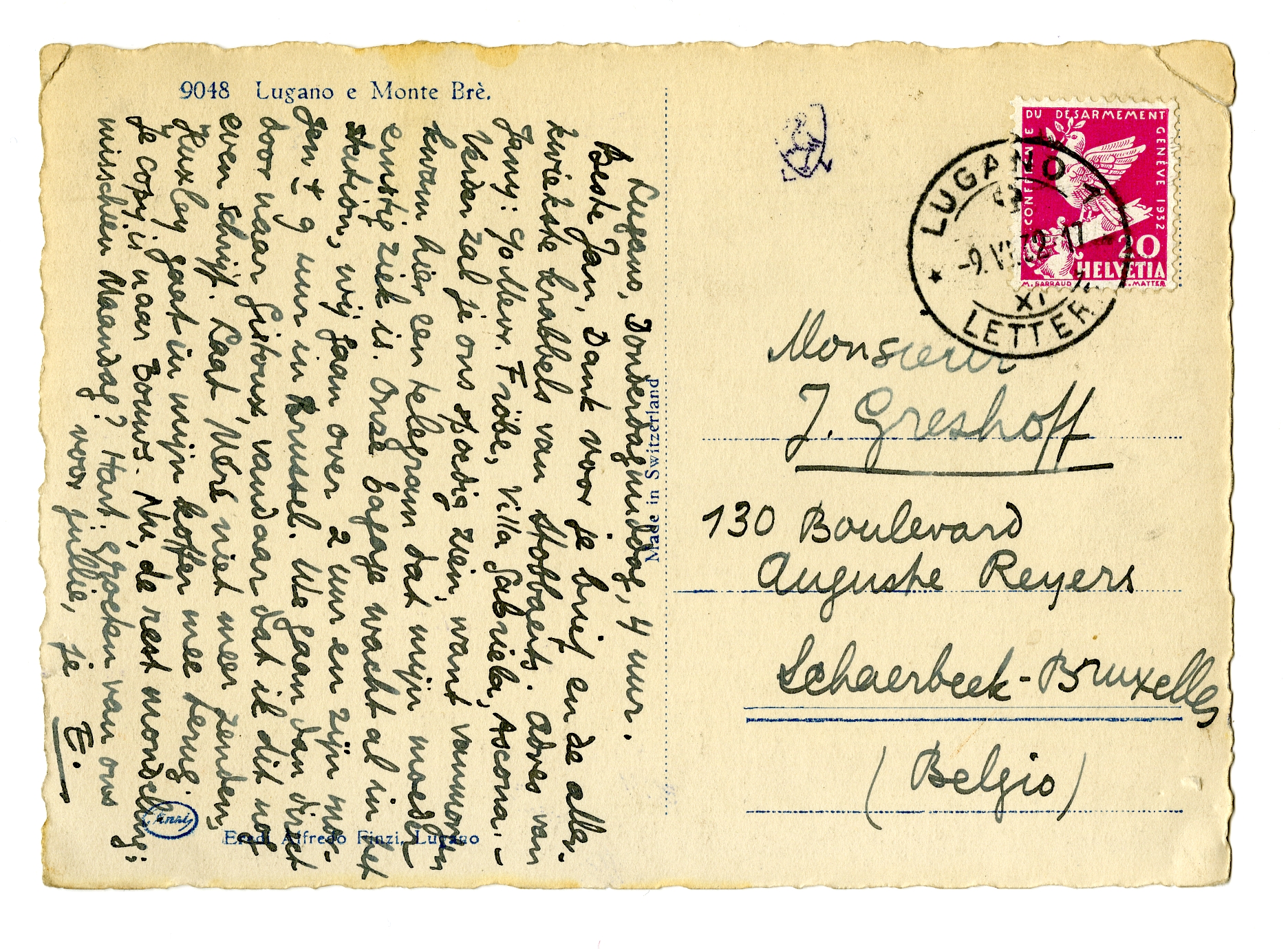 Beste Jan, Dank voor je brief en de allerkwiekste krabbels van Stobbaerts. Adres van Jany: c/o Mevr. Fröbe, Villa Gabriela, Ascona. - Verder zal je ons spoedig zien, want vanmorgen kwam hier een telegram dat mijn moeder ernstig ziek is. Onze bagage wacht al in het station, wij gaan over 2 uur en zijn morgen ± 9 uur in Brussel. We gaan dan direct door naar Gistoux, vandaar dat ik dit nog even schrijf. Laat Méré niet meer zenden, Huxley2190 gaat in mijn koffer mee terug. Je copy is naar Bouws. Nu, de rest mondeling; misschien Maandag? Hart. groeten van ons voor jullie,