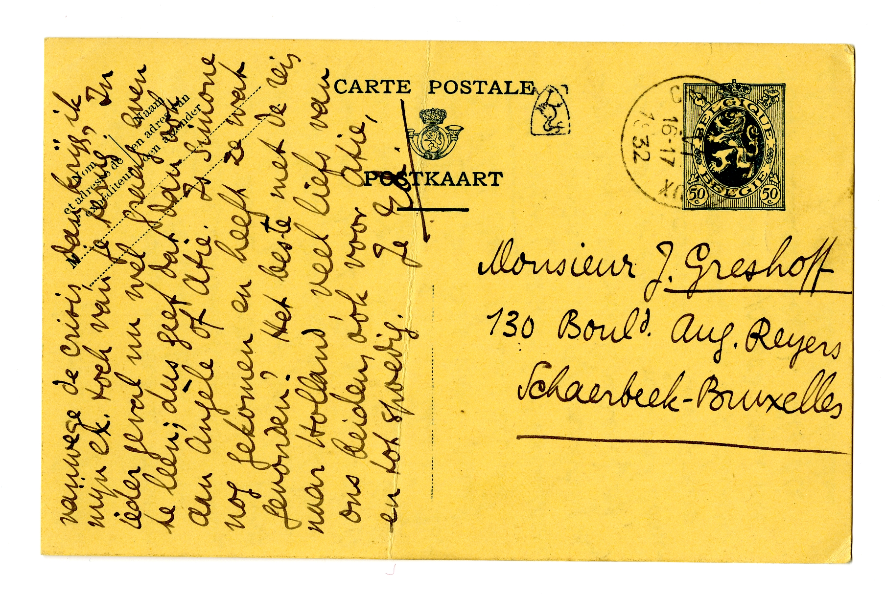 Er is weer kans op dat ik Donderdag niet in Brussel kom, omdat dan allerlei menschen hier komen die de auto noodig hebben, geloof ik. Als we dus nog iets hebben af te doen samen, doe het dan even per brief. Je krijgt nog geld van me voor die kiekjes. Geef anders alles op aan Atie en Angèle. En o ja, Bep wou graag Le Petit Ami lezen; en jij hebt mijn (jouw ex-) exemplaar teruggenomen, in afwachting van, - of liever vooruitloopend op, die pracht-editie van dat comité met vicomtesse Zus-of-Zoo tot secretaresse, die tot dusver alleen maar 40 pop van me heeft geëncaisseerd. Als die editie nu ook blijft steken, vanwege de crisis, dan krijg ik mijn ex. toch van je terug? In ieder geval nu wel graag even te leen; dus geef dat dan ook aan Angèle of Atie. Is Simone nog gekomen en heeft ze wat gevonden? Het beste met de reis naar Holland, veel liefs van ons beiden, ook voor Atie, en tot spoedig.
