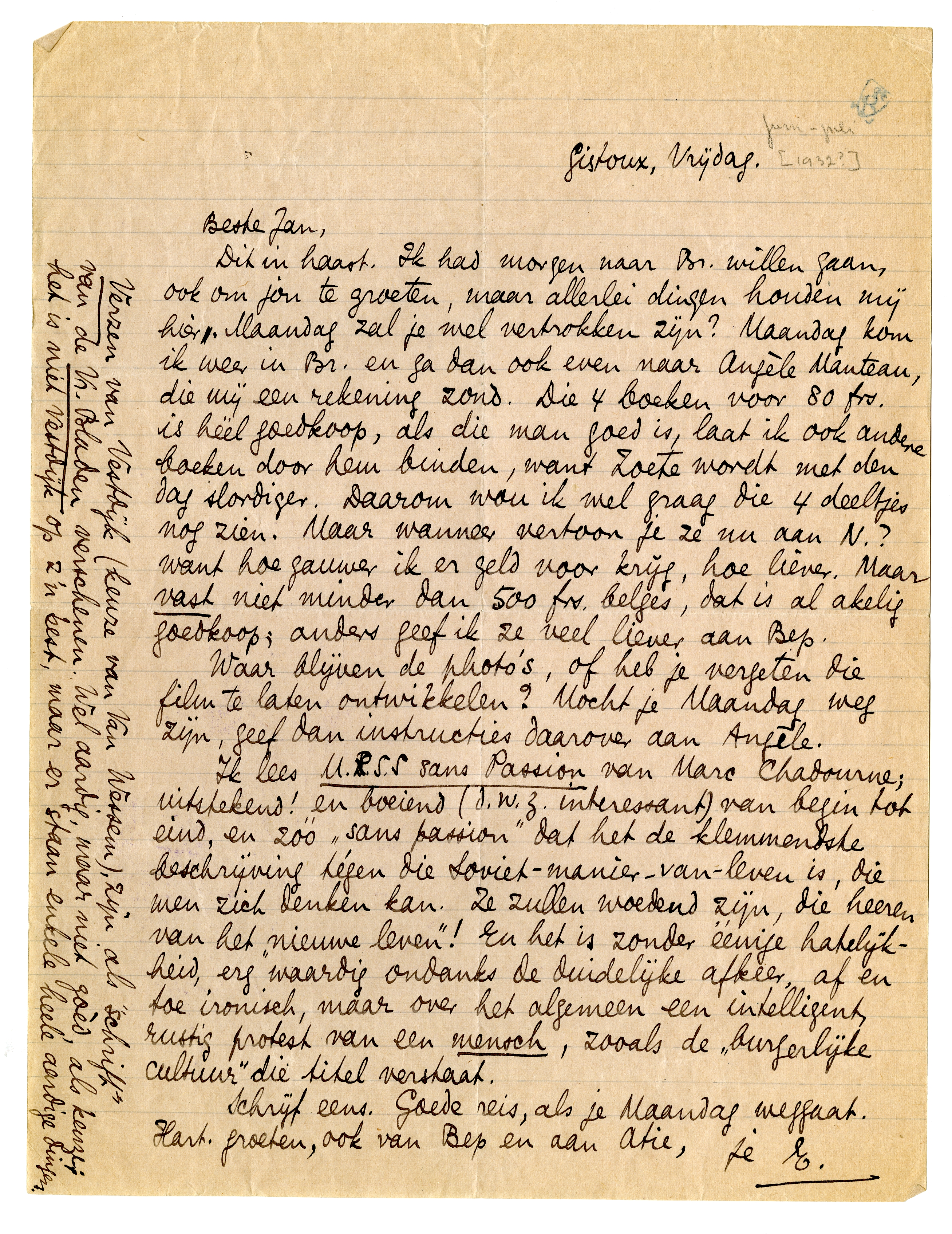Ik lees U.R.S.S. sans Passion van Mare Chadourne; uitstekend! en boeiend (d.w.z. interessant) van begin tot eind, en zóó ‘sans passion’ dat het de klemmendste beschrijving tégen die Soviet-manier-vanleven is, die men zich denken kan. Ze zullen woedend zijn, die heeren van het ‘nieuwe leven’! En het is zonder éénige hatelijkheid, erg waardig ondanks de duidelijke afkeer, af en toe ironisch, maar over het algemeen een intelligent, rustig protest van een mensch, zooals de ‘burgerlijke cultuur’ die titel verstaat.