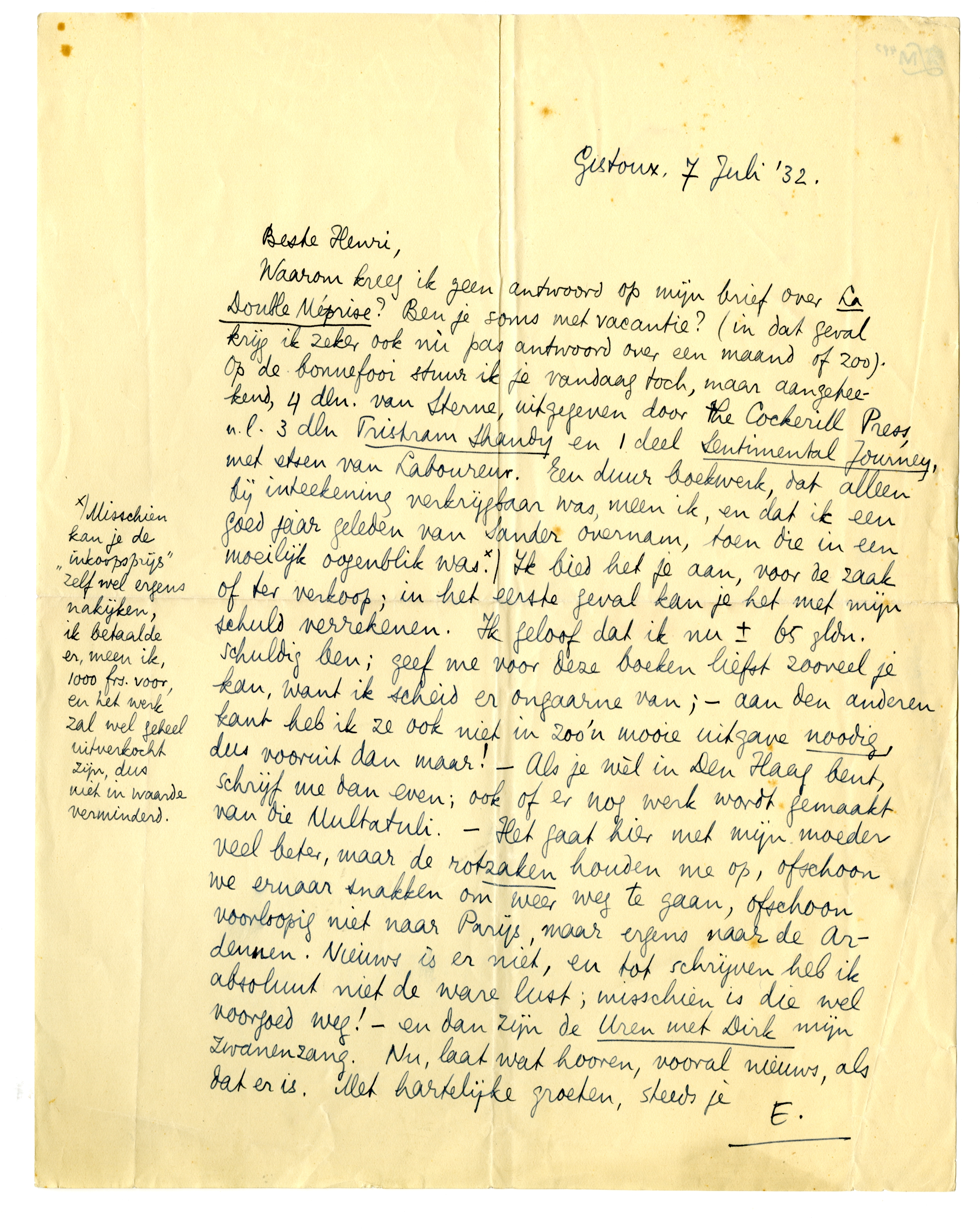 Waarom kreeg ik geen antwoord op mijn brief over La Double Méprise? Ben je soms met vacantie? (in dat geval krijg ik zeker ook nù pas antwoord over een maand of zoo). Op de bonnefooi stuur ik je vandaag toch, maar aangeteekend, 4 dln. van Sterne, uitgegeven door the Cockerill Press, n.l. 3 dln Tristram Shandy en 1 deel Sentimental Journey, met etsen van Laboureur.2224 Een duur boekwerk, dat alleen bij inteekening verkrijgbaar was, meen ik, en dat ik een goed jaar geleden van Sander overnam, toen die in een moeilijk oogenblik was.* Ik bied het je aan, voor de zaak of ter verkoop; in het eerste geval kan je het met mijn schuld verrekenen. Ik geloof dat ik nu ± 65 gldn. schuldig ben; geef me voor deze boeken liefst zooveel je kan, want ik scheid er ongaarne van; - aan den anderen kant heb ik ze ook niet in zoo'n mooie uitgave noodig, dus vooruit dan maar! - Als je wèl in Den Haag bent, schrijf me dan even; ook of er nog werk wordt gemaakt van die Multatuli. - Het gaat hier met mijn moeder veel beter, maar de rotzaken houden me op, ofschoon we ernaar snakken om weer weg te gaan, ofschoon voorloopig niet naar Parijs, maar ergens naar de Ardennen. Nieuws is er niet, en tot schrijven heb ik absoluut niet de ware lust; misschien is die wel voorgoed weg! - en dan zijn de Uren met Dirk mijn zwanenzang. Nu, laat wat hooren, vooral nieuws, als dat er is. Met hartelijke groeten, steeds je