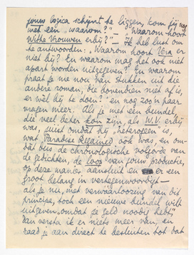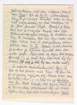 Je nieuwe verhalenbundel kan ik zoo op het papier niet ‘zien’. Ik ken die fragmenten niet, en eig. bijna niets van dit alles; dus?... - Wat nu je Dichten over den Dood2237 betreft, het begin vind ik de verwardste rotrommel die ik sinds tijden las; het slot daarentegen goed, - al ben ik het half en half met Rien eens dat je misschien beter deed, je vijanden niet met déze bekentenissen te plezieren door uitgave ervan. In Holland wordt zooiets met de noodige ‘eeuwigheidstermen’ natuurlijk in alle bladen geciteerd; en dan met van die commentaren, waar de dichterlijke geesten bij ons ook zoo gul mee zijn! Ik moet er niet aan denken. In ieder geval: blz. 1-3 is voor mij belabberd - en je zult met recht hiermee eerst eenige menschen, ‘die men niet bij het gepeupel dorst stellen’, doen grijnzen! - terwijl ik blz. 4 en 5 met spanning las. (Bep is geheel van ditzelfde gevoelen.)