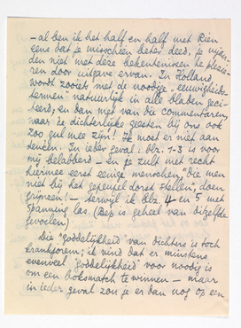 Die ‘goddelijkheid’ van dichters is toch krankjorem; ik vind dat er minstens evenveel ‘goddelijkheid’ voor noodig is om een boksmatch te winnen - maar in ieder geval zou je er dan nog op een andere manier over moeten spreken dan je het hier deed. En die Onze-Lieve-Heer die je ‘leenheer’ heet! Neen, ik kan daar alleen maar beroerd van worden; het is me te kras, en te griezelig spiritistisch!