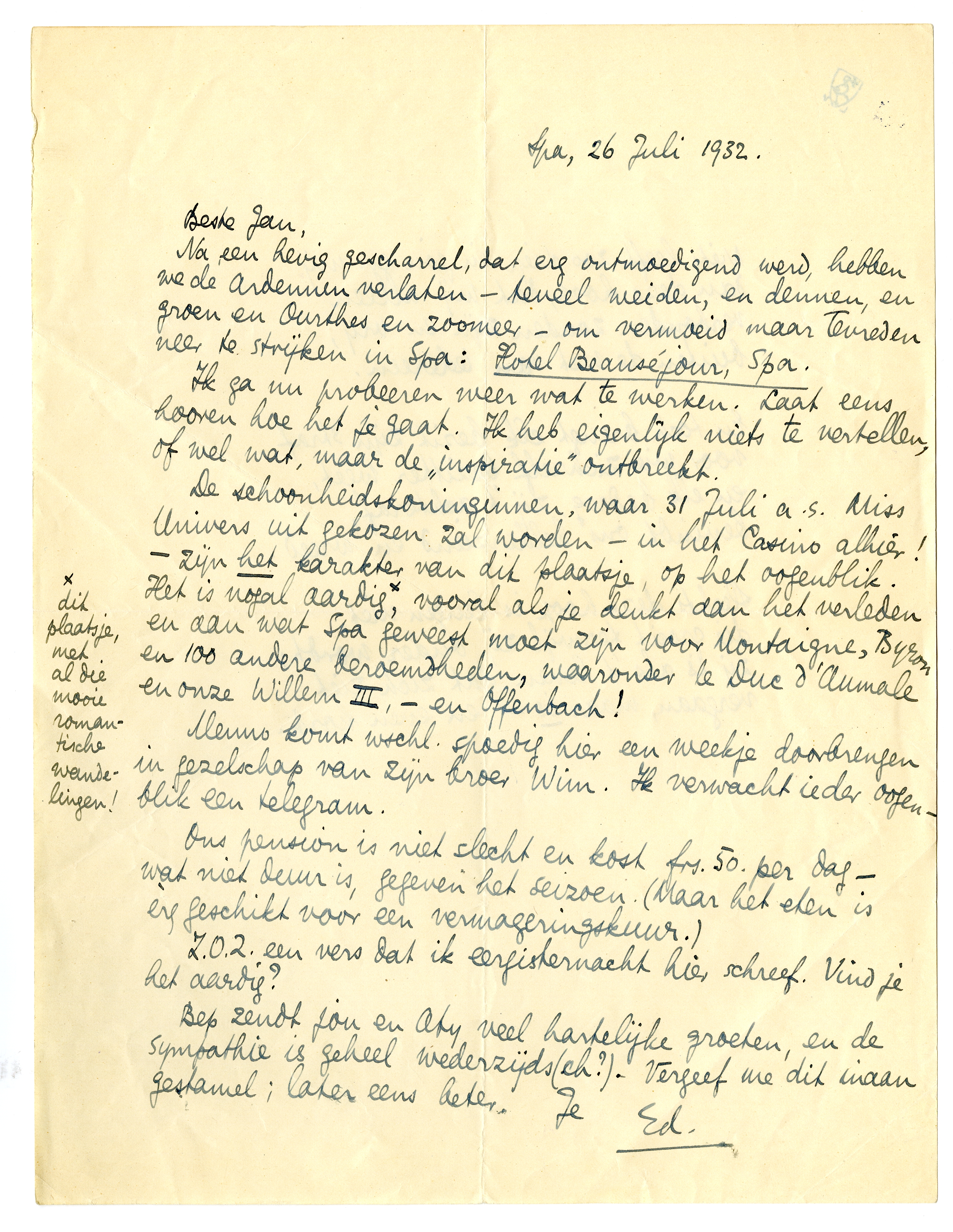 De schoonheidskoninginnen, waar 31 Juli a.s. Miss Univers uit gekozen zal worden - in het Casino alhier! - zijn het karakter van dit plaatsje, op het oogenblik. Het is nogal aardig,* vooral als je denkt aan het verleden en aan wat Spa geweest moet zijn voor Montaigne, Byron en 100 andere beroemdheden, waaronder Le Duc d'Aumale en onze Willem III, - en Offenbach!