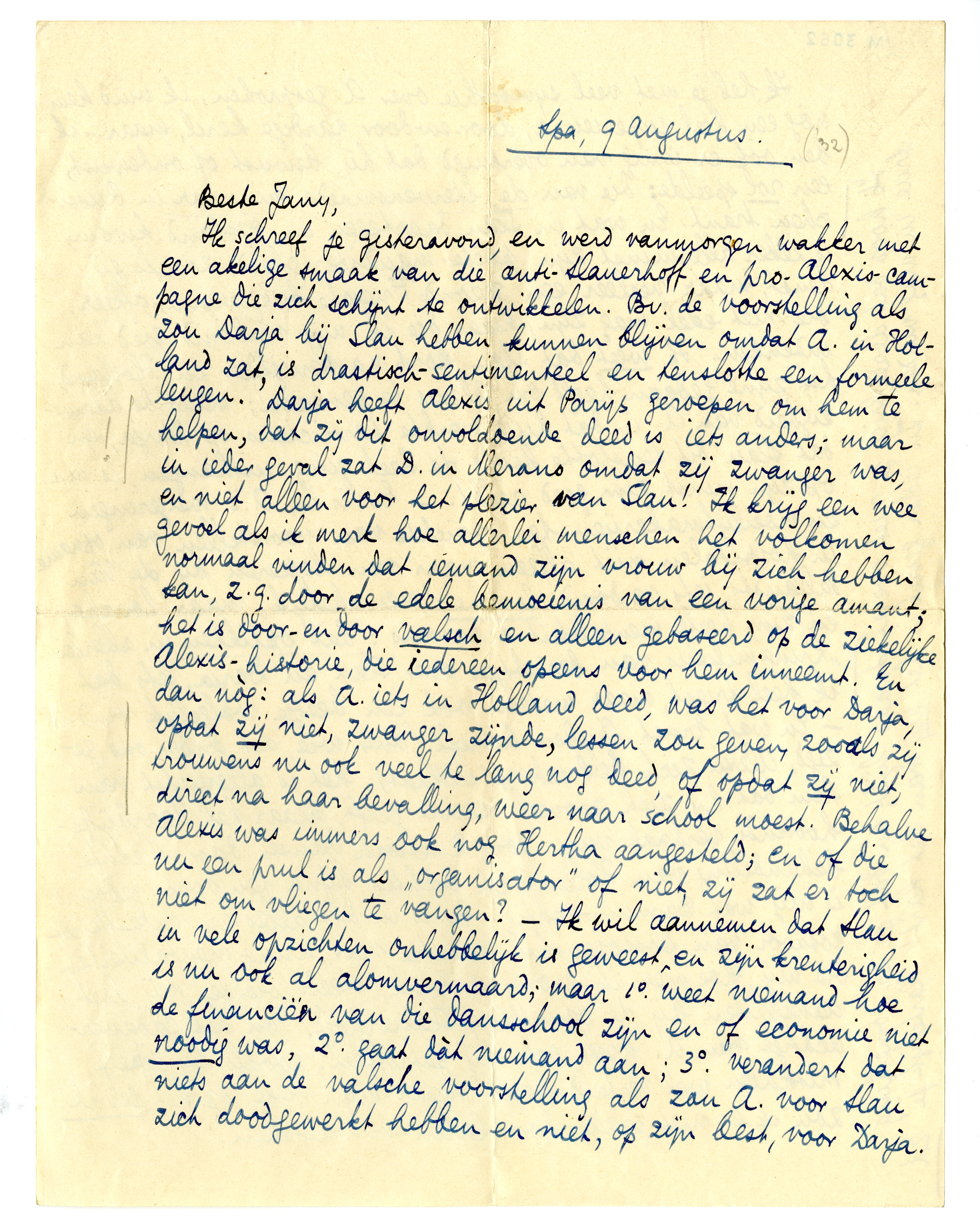 Ik schreef je gisteravond, en werd vanmorgen wakker met een akelige smaak van die anti-Slauerhoff en pro-Alexis-campagne2294 die zich schijnt te ontwikkelen. Bv. de voorstelling als zou Darja bij Slau hebben kunnen blijven omdat A. in Holland zat, is drastisch-sentimenteel en tenslotte een formeele leugen. Darja heeft Alexis uit Parijs geroepen om hem te helpen, dat zij dit onvoldoende deed is iets anders; maar in ieder geval zat D. in Merano2295 omdat zij zwanger was, en niet alleen voor het plezier van Slau! Ik krijg een wee gevoel als ik merk hoe allerlei menschen het volkomen normaal vinden dat iemand zijn vrouw bij zich hebben kan, z.g. door de edele bemoeienis van een vorige amant; het is door-en-door valsch en alleen gebaseerd op de ziekelijke Alexis-historie, die iedereen opeens voor hem inneemt. En dan nòg: als A. iets in Holland deed, was het voor Darja, opdat zij niet, zwanger zijnde, lessen zou geven, zooals zij trouwens nu ook veel te lang deed, of opdat zij niet, direct na haar bevalling, weer naar school moest. Behalve Alexis was immers ook Hertha aangesteld; en of die nu een prul is als ‘organisator’ of niet, zij zat er toch niet om vliegen te vangen? - Ik wil aannemen dat Slau in vele opzichten onhebbelijk is geweest, en zijn krenterigheid is nu ook al alomvermaard; maar 1o. weet niemand hoe de financiën van die dansschool zijn en of economie niet noodig was, 2o. gaat dàt niemand aan; 3o. verandert dat niets aan de valsche voorstelling als zou A. voor Slau zich doodgewerkt hebben en niet, op zijn best, voor Darja.
