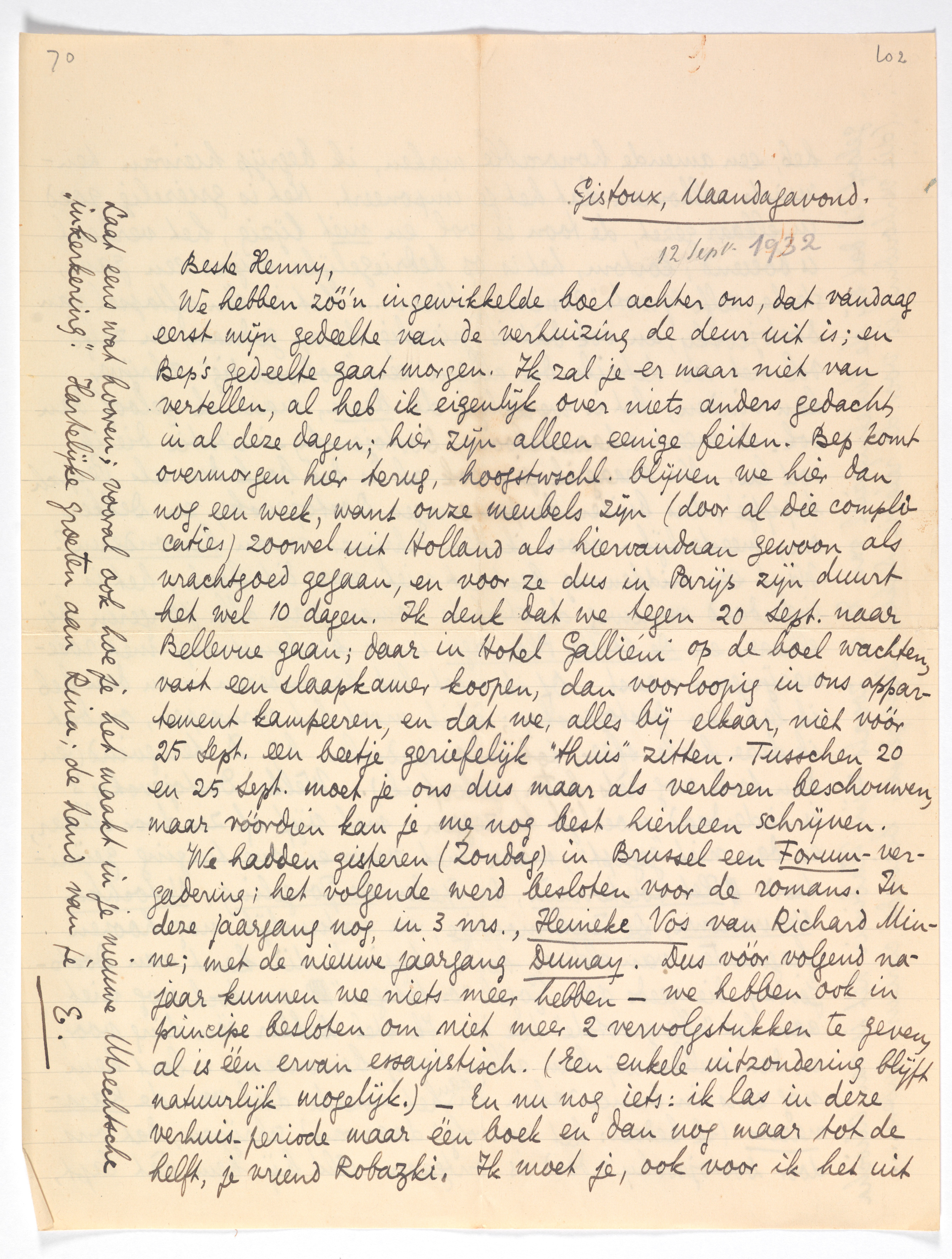 We hebben zóó'n ingewikkelde boel achter ons, dat vandaag eerst mijn gedeelte van de verhuizing de deur uit is; en Bep's gedeelte gaat morgen. Ik zal je er maar niet van vertellen, al heb ik eigenlijk over niets anders gedacht, in al deze dagen; hier zijn alleen eenige feiten. Bep komt overmorgen hier terug, hoogstwschl. blijven we hier dan nog een week, want onze meubels zijn (door al die complicaties) zoowel uit Holland als hiervandaan gewoon als vrachtgoed gegaan, en voor ze dus in Parijs zijn duurt het wel 10 dagen. Ik denk dat we tegen 20 Sept. naar Bellevue gaan; daar in Hotel Galliéni op de boel wachten, vast een slaapkamer koopen, dan voorloopig in ons appartement kampeeren, en dat we, alles bij elkaar, niet vóór 25 Sept. een beetje geriefelijk ‘thuis’ zitten. Tusschen 20 en 25 Sept. moet je ons dus maar als verloren beschouwen, maar vóórdien kan je me nog best hierheen schrijven.