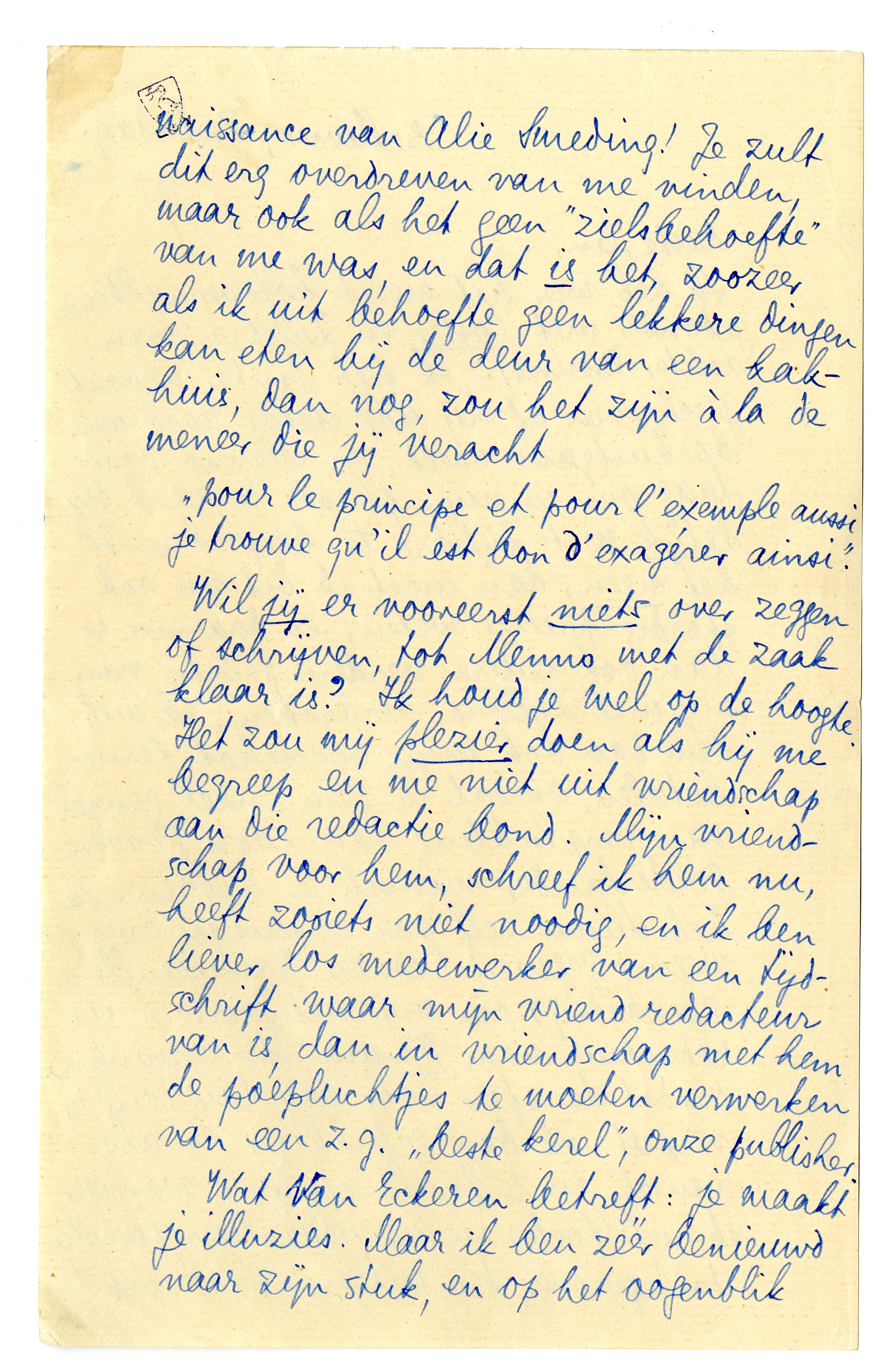 Wil jij er vooreerst niets over zeggen of schrijven, tot Menno met de zaak klaar is? Ik houd je wel op de hoogte. Het zou mij plezier doen als hij me begreep en me niet uit vriendschap aan die redactie bond. Mijn vriendschap voor hem, schreef ik hem nu, heeft zooiets niet noodig, en ik ben liever los medewerker van een tijdschrift waar mijn vriend redacteur van is, dan in vriendschap met hem de poepluchtjes te moeten verwerken van een z.g. ‘beste kerel’, onze publisher.